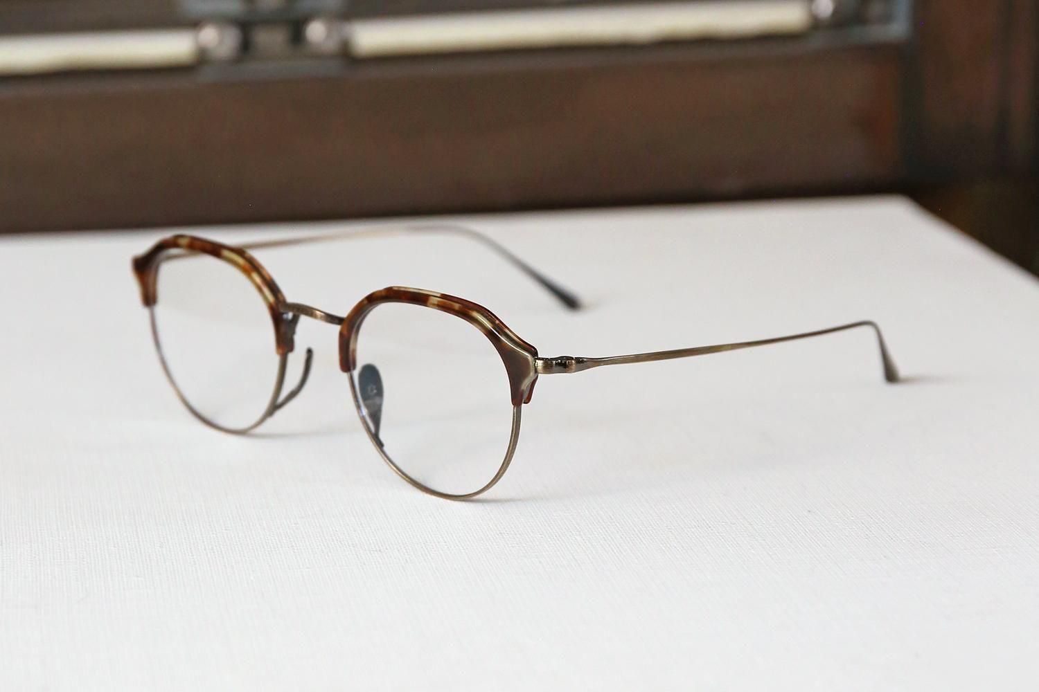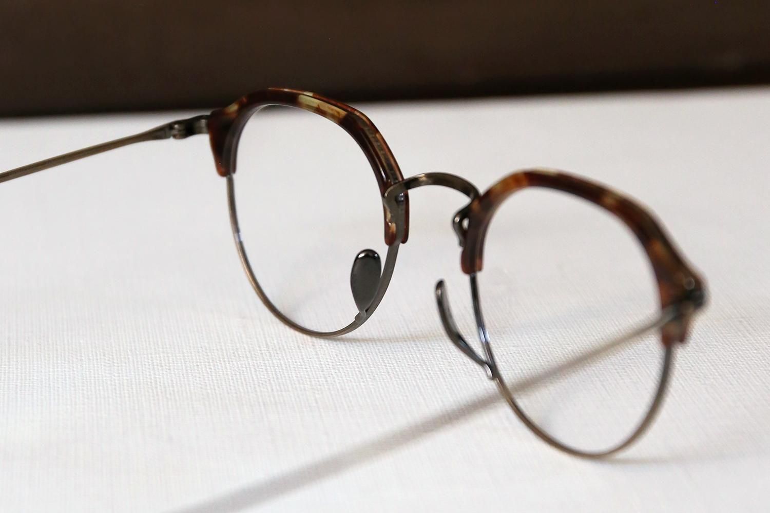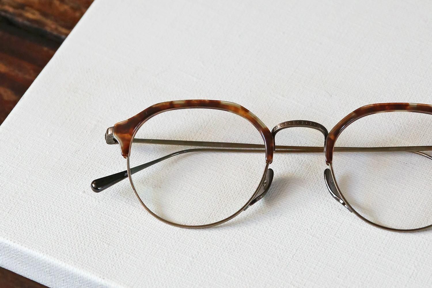 一見するとシンプルなデザインですが、ブロウラインはプラスチック、アンダーリムはチタンという異素材での組み合わせで構成されたコンビネーションフレーム。特にクラウンパント型(上部が直線で角ばっているデザイン)のブローフレームは非常に珍しく、他にはないユニークな個性を演出します。
