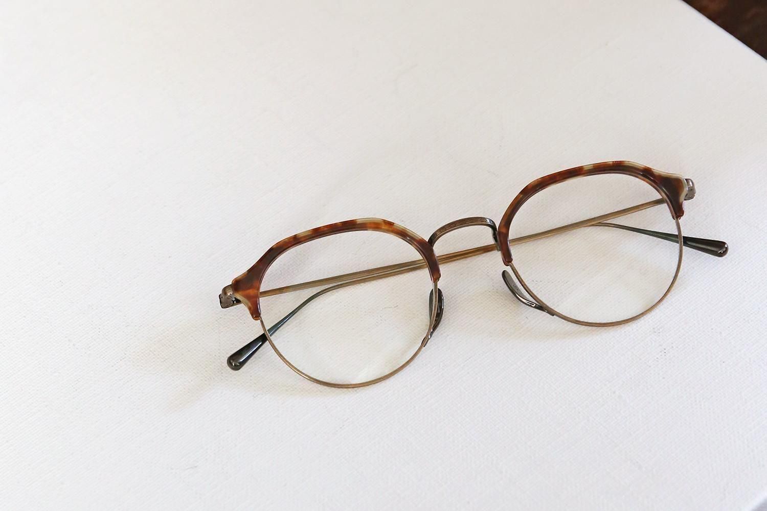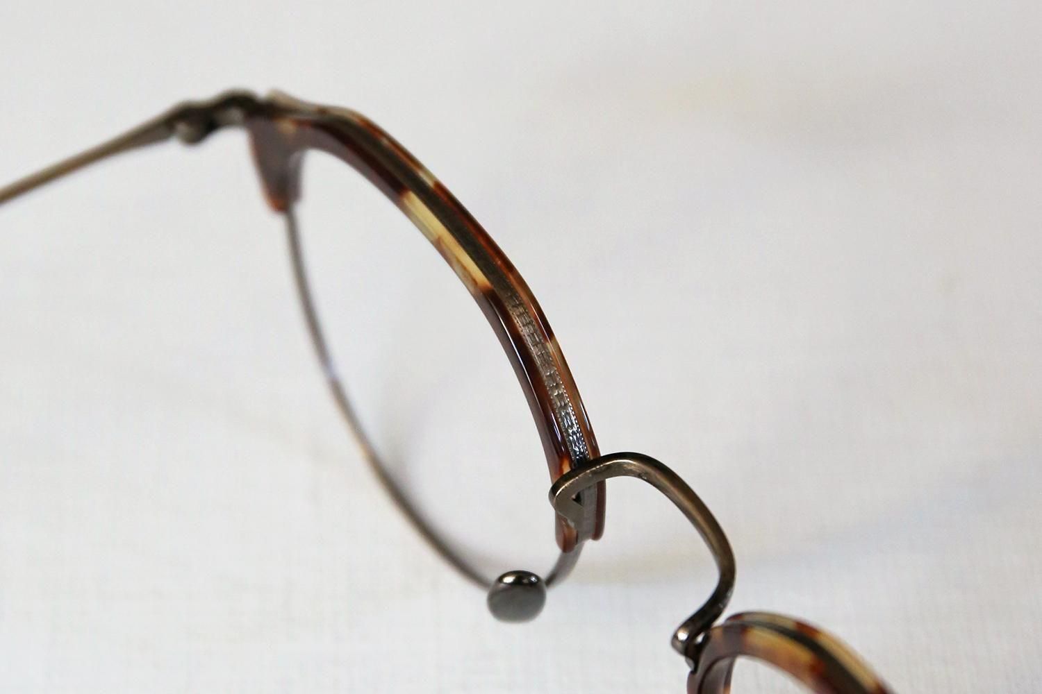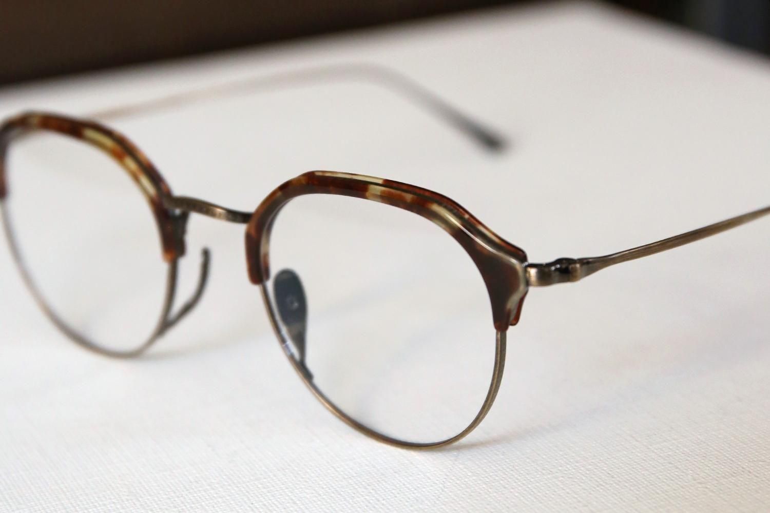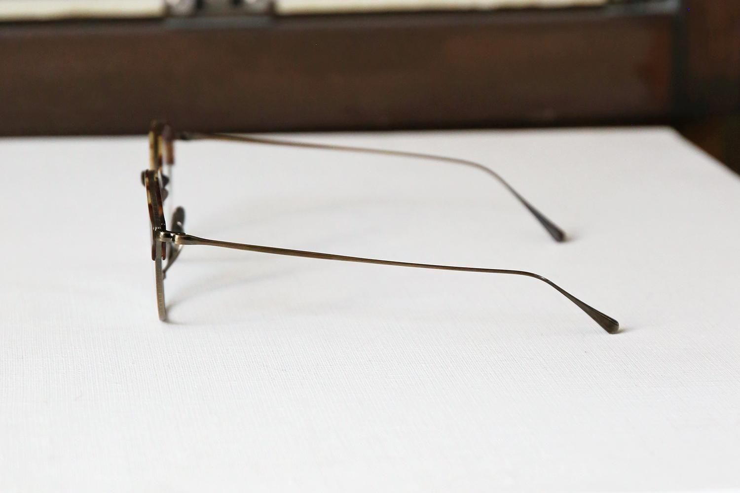 一見するとシンプルなデザインですが、ブロウラインはプラスチック、アンダーリムはチタンという異素材での組み合わせで構成されたコンビネーションフレーム。特にクラウンパント型(上部が直線で角ばっているデザイン)のブローフレームは非常に珍しく、他にはないユニークな個性を演出します。