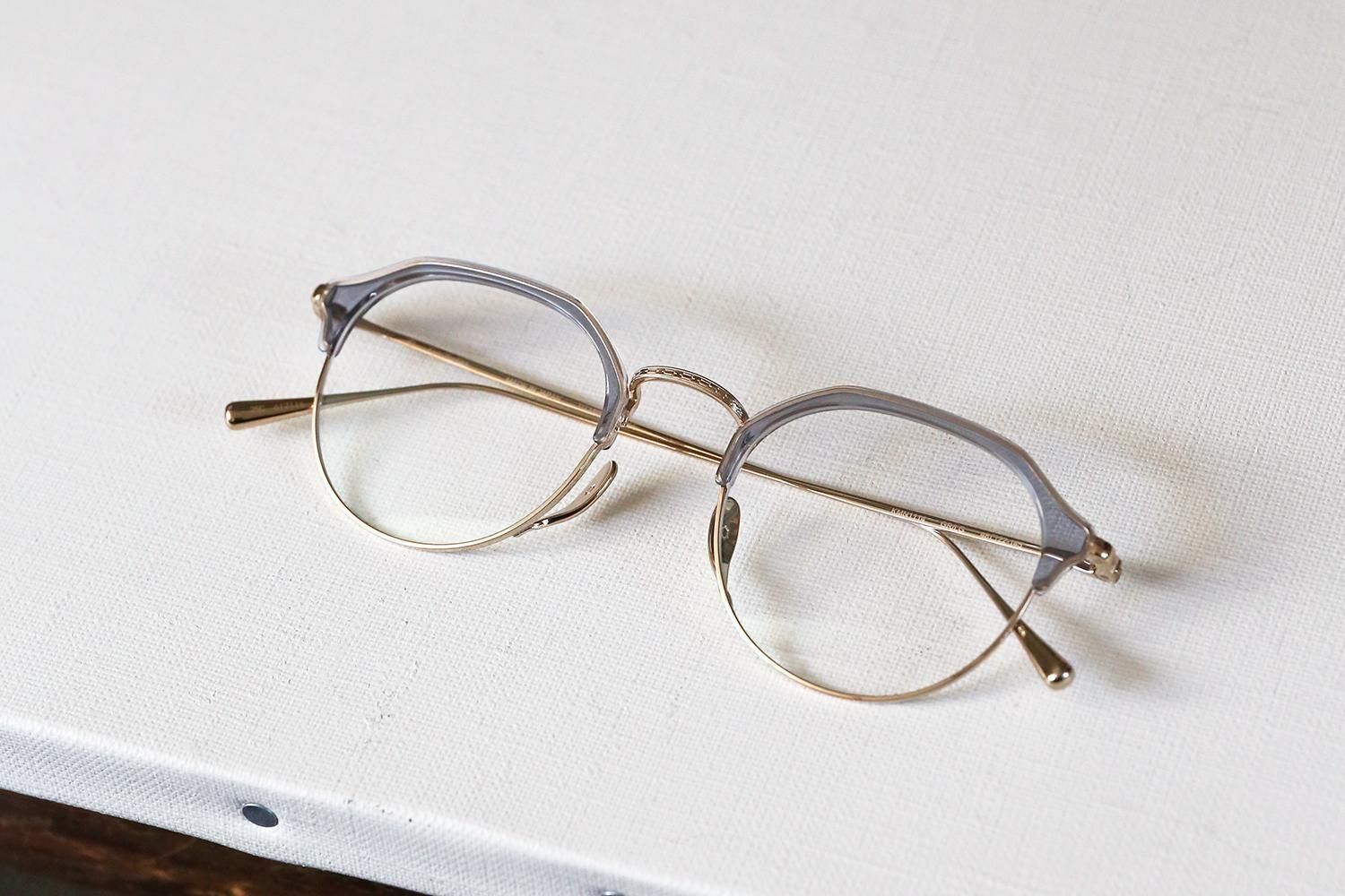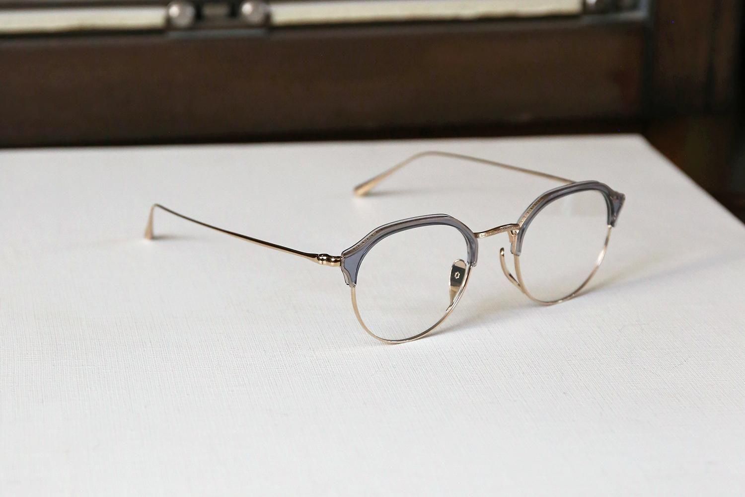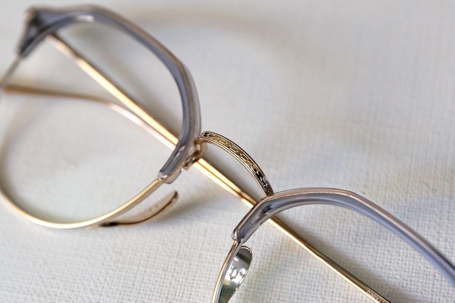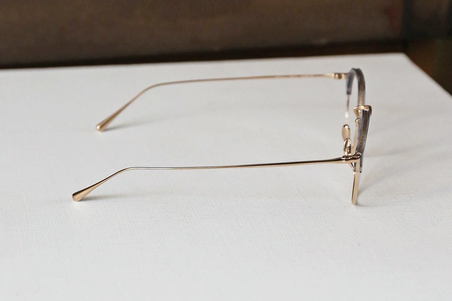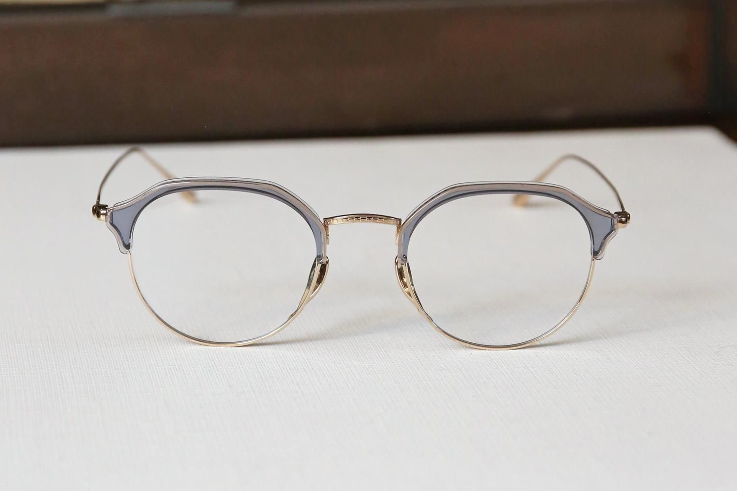 一見するとシンプルなデザインですが、ブロウラインはプラスチック、アンダーリムはチタンという異素材での組み合わせで構成されたコンビネーションフレーム。特にクラウンパント型(上部が直線で角ばっているデザイン)のブローフレームは非常に珍しく、他にはないユニークな個性を演出します。