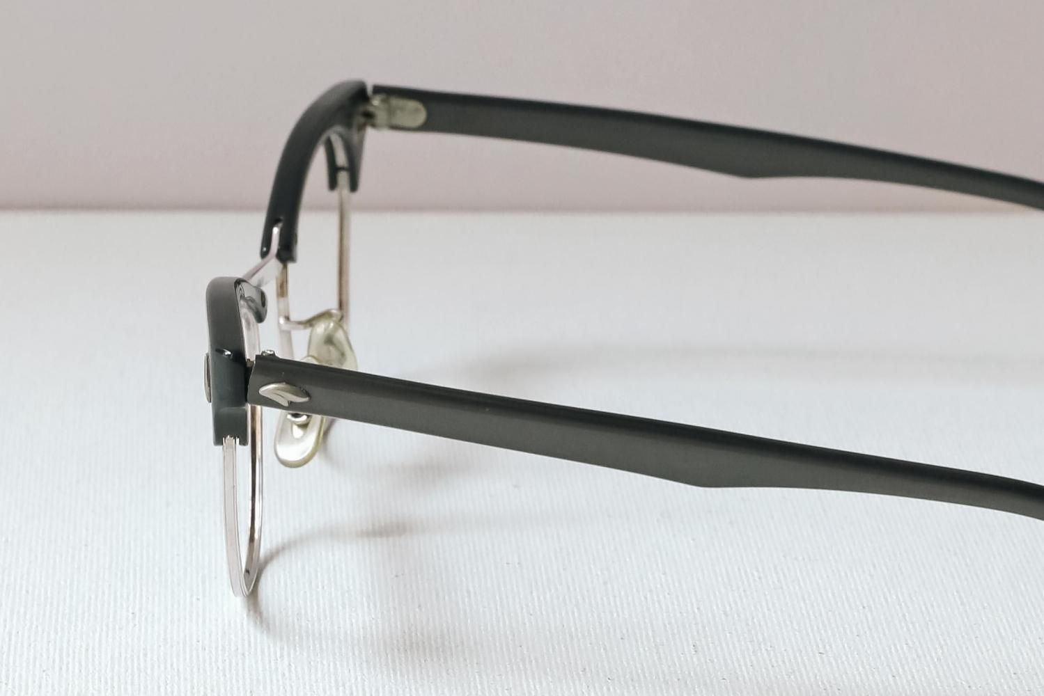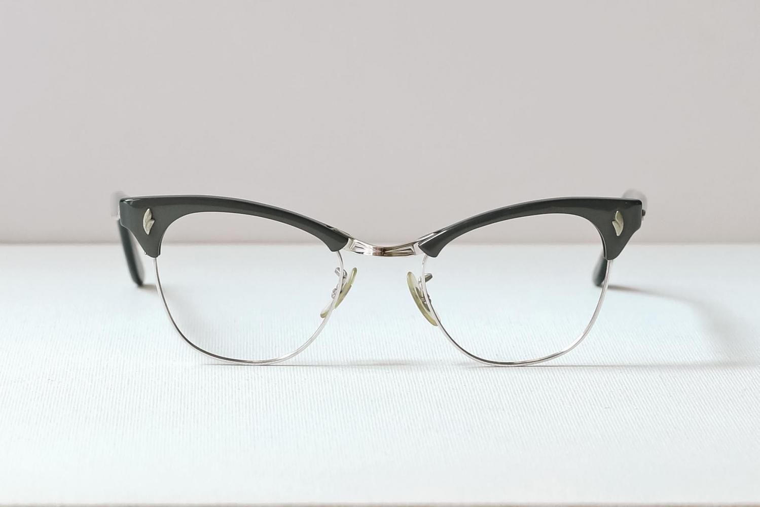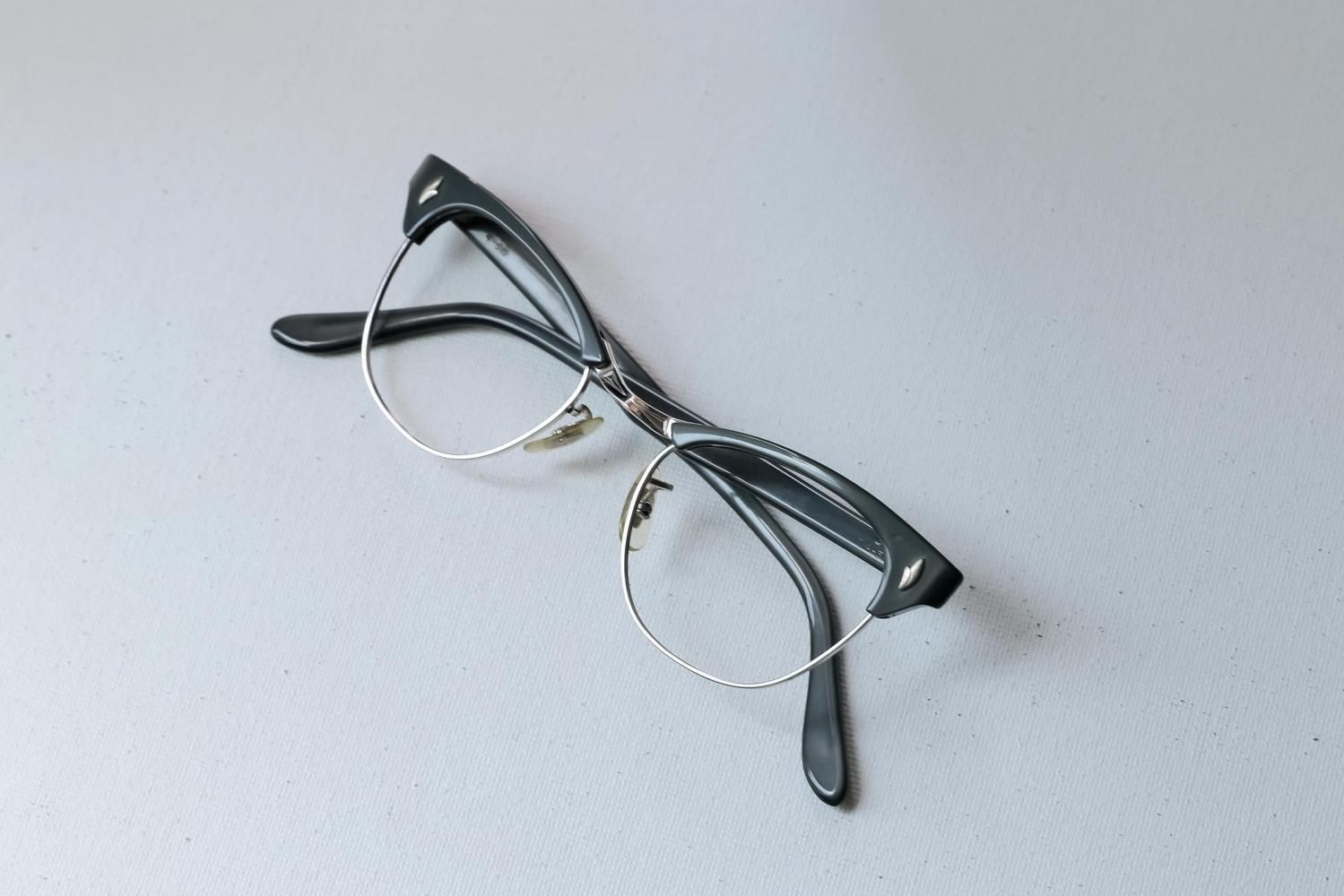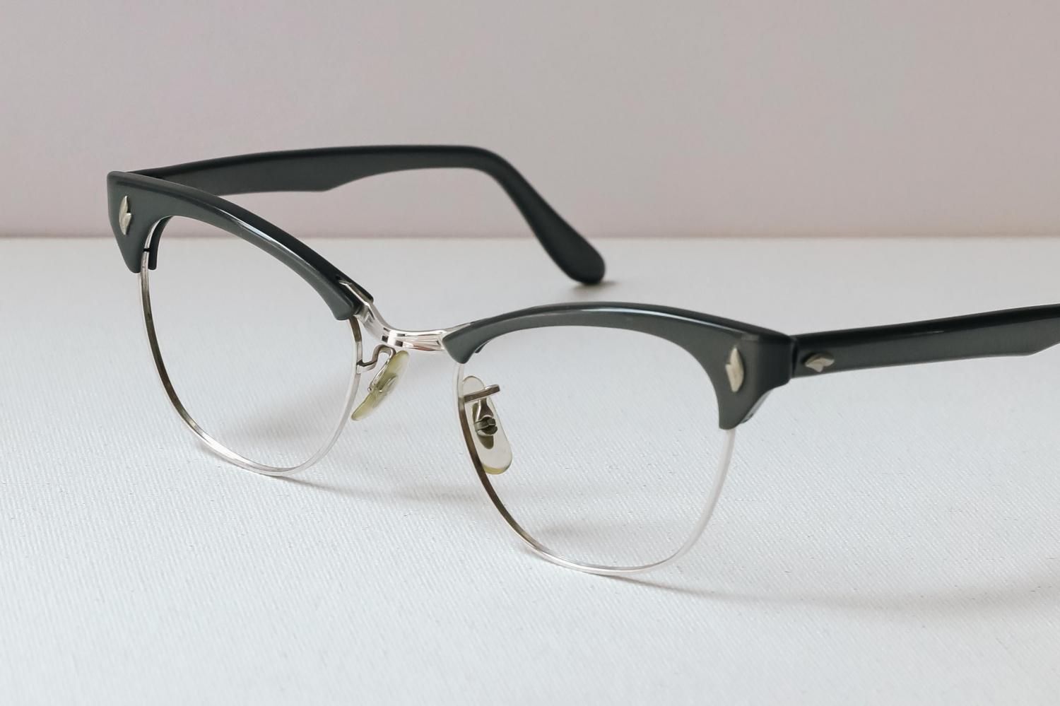 こちらの一本は、ブランドらしいブロウラインスタイルを基調としたキャットアイ型。フロント上部にはグレーのセル生地を配し、下部はシルバーのメタルで構成されたコンビネーションフレームです。グレーのセルは落ち着いたニュアンスを生み出し、キャットアイ特有の吊り上がったシェイプが知的でクラシックな雰囲気を演出。もともとはレディース向けのデザインでしたが、現代では女性のエレガントな装いに加え、男性があえて個性的にかけることでファッションのアクセントにもなります。さらに、智元には特徴的な飾り蝶番が施され、ヴィンテージならではの存在感を一層引き立てています。