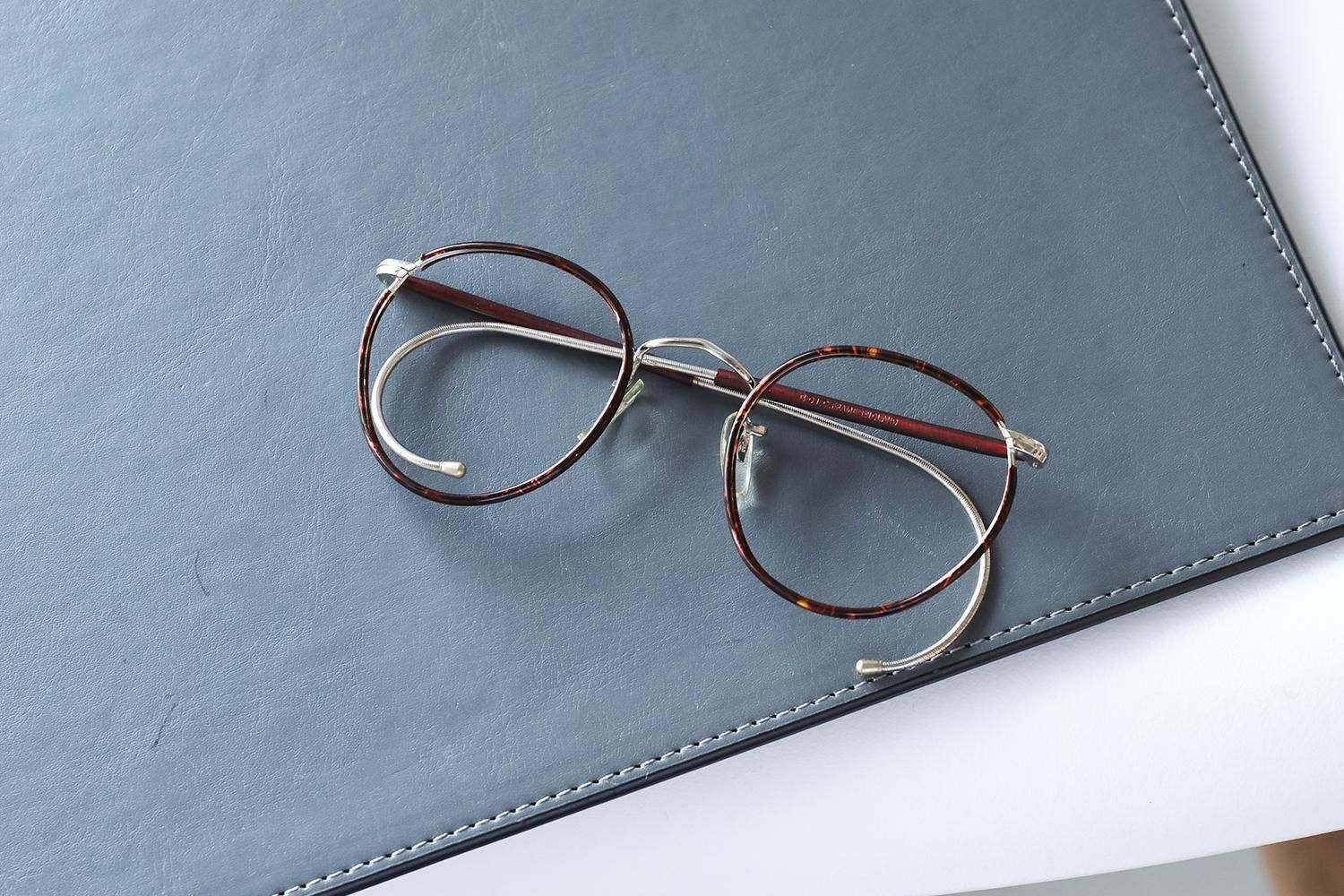 極細のメタルリムをセル素材で巻き込み、柔らかさと奥行きを演出したこのデザイン。