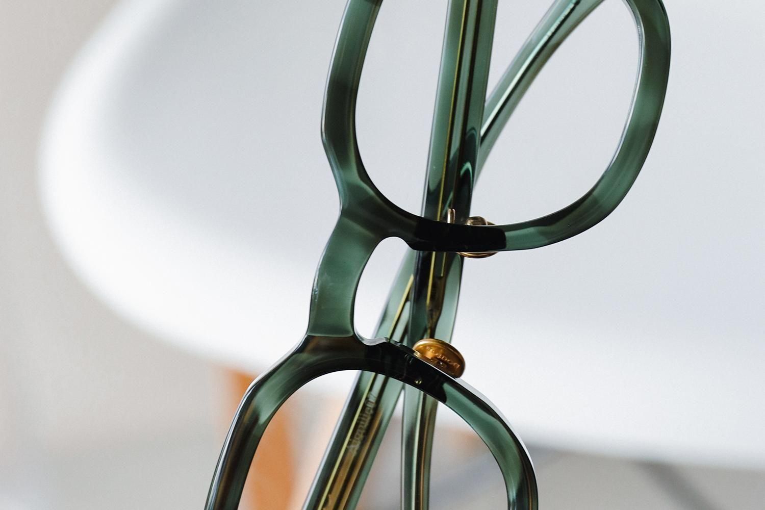 「縫い針」をイメージしたテンプル芯や「ボタン」をイメージされたゴールドカラーの丸い鼻パットも特徴的。