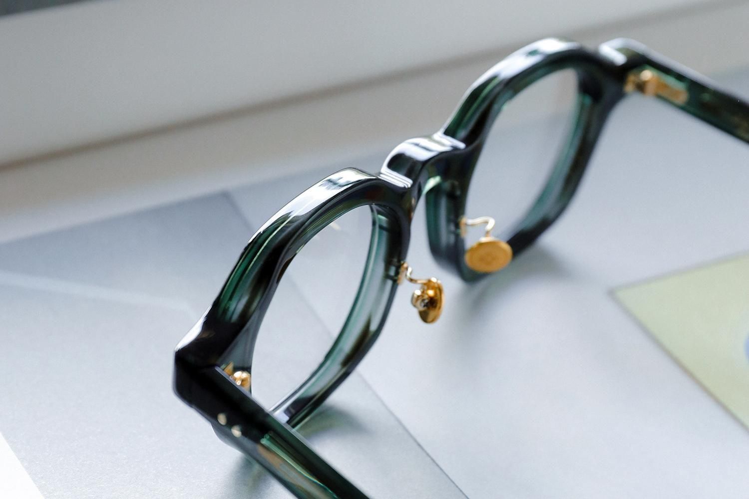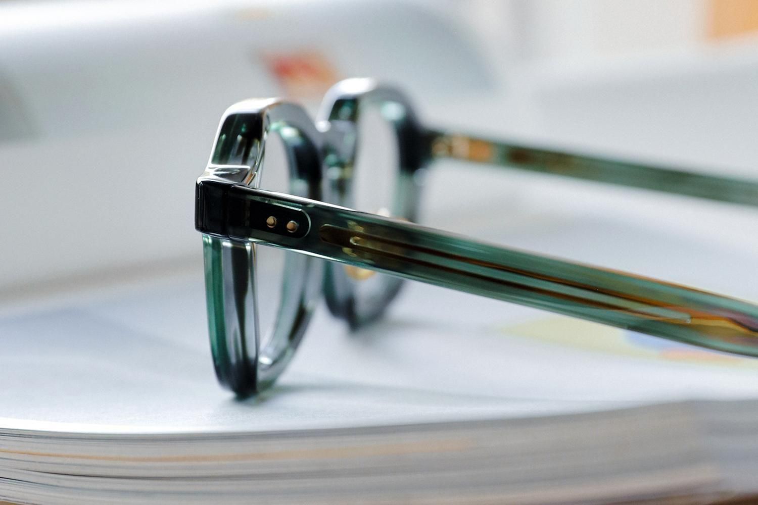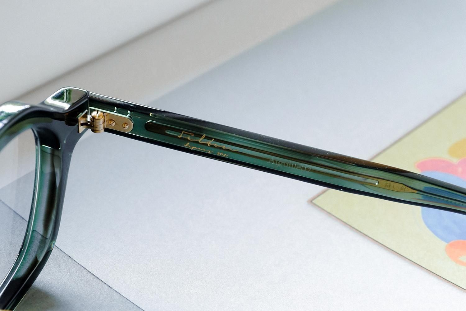 さらに、「縫い針」をイメージしたテンプル芯や、「ボタン」をイメージしたゴールドカラーの丸い鼻パッドなど、細部にもこだわり抜いたデザインが施されています。これらのディテールが、全体のデザインに統一感をもたらし、Filtonらしい上品さと洗練さを際立たせています。