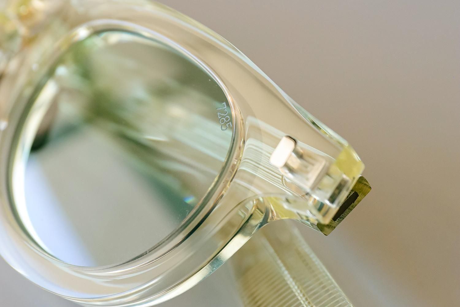 この厚みがもたらすのは、ただの重厚感ではありません。熟練の職人により、通常の5倍の時間をかけた高度なカッティングと研磨によって、どっしりとした重厚な存在感だけでなく、そのフロントに最適なバランスを保つテンプルの太さ、チタンパッドの繊細さに美学を感じる一本です。