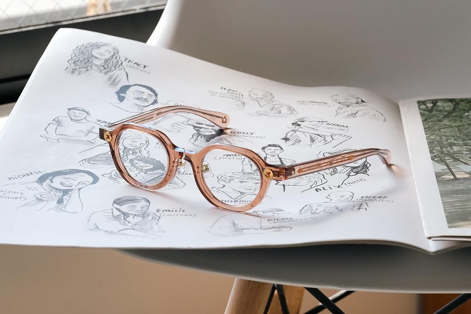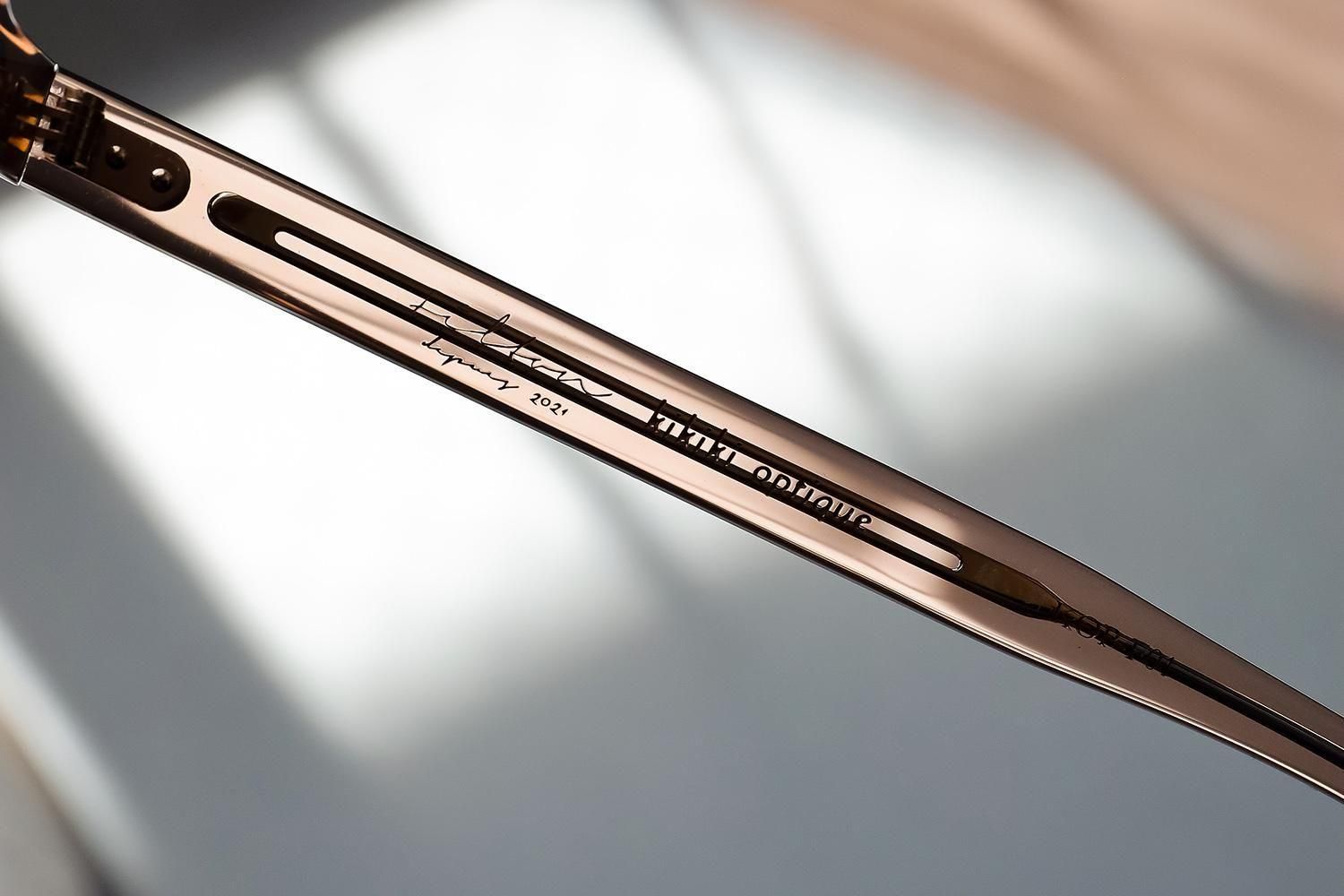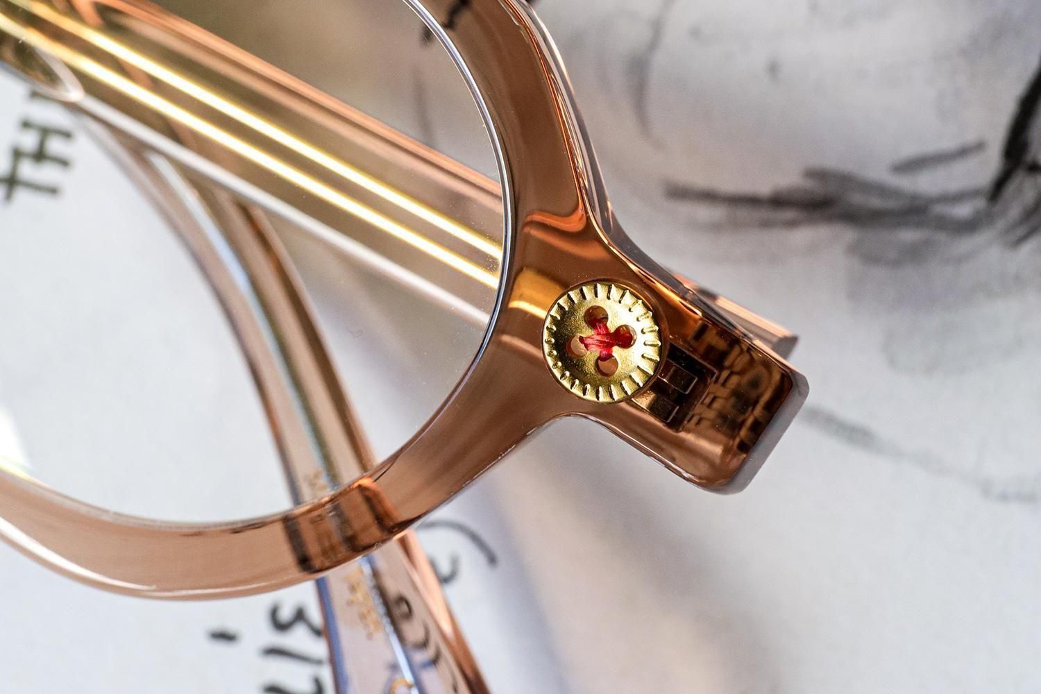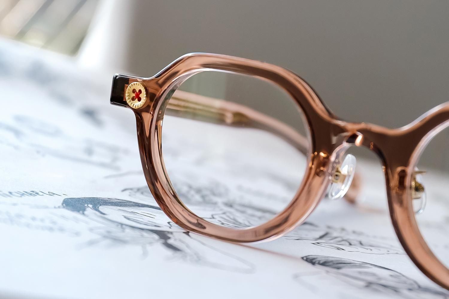 テンプル内部には、縫い針をイメージした芯金が通り、智元には、本物の糸を一本ずつ巻き付けたボタンの飾り鋲。その上から透明レジンで丁寧に固め、立体的で、まるで“アクセサリー”のような仕上がりに。