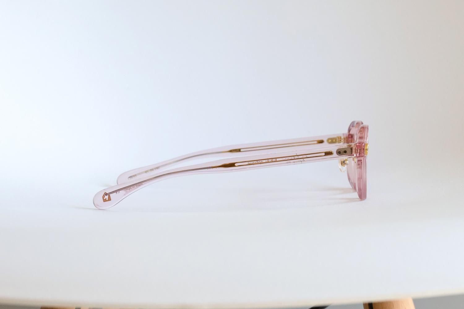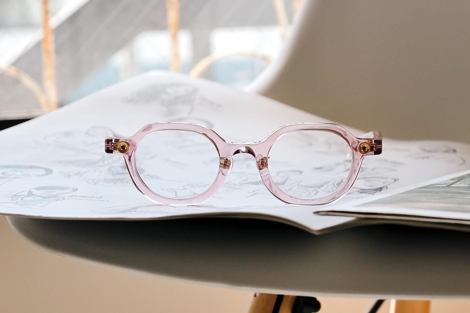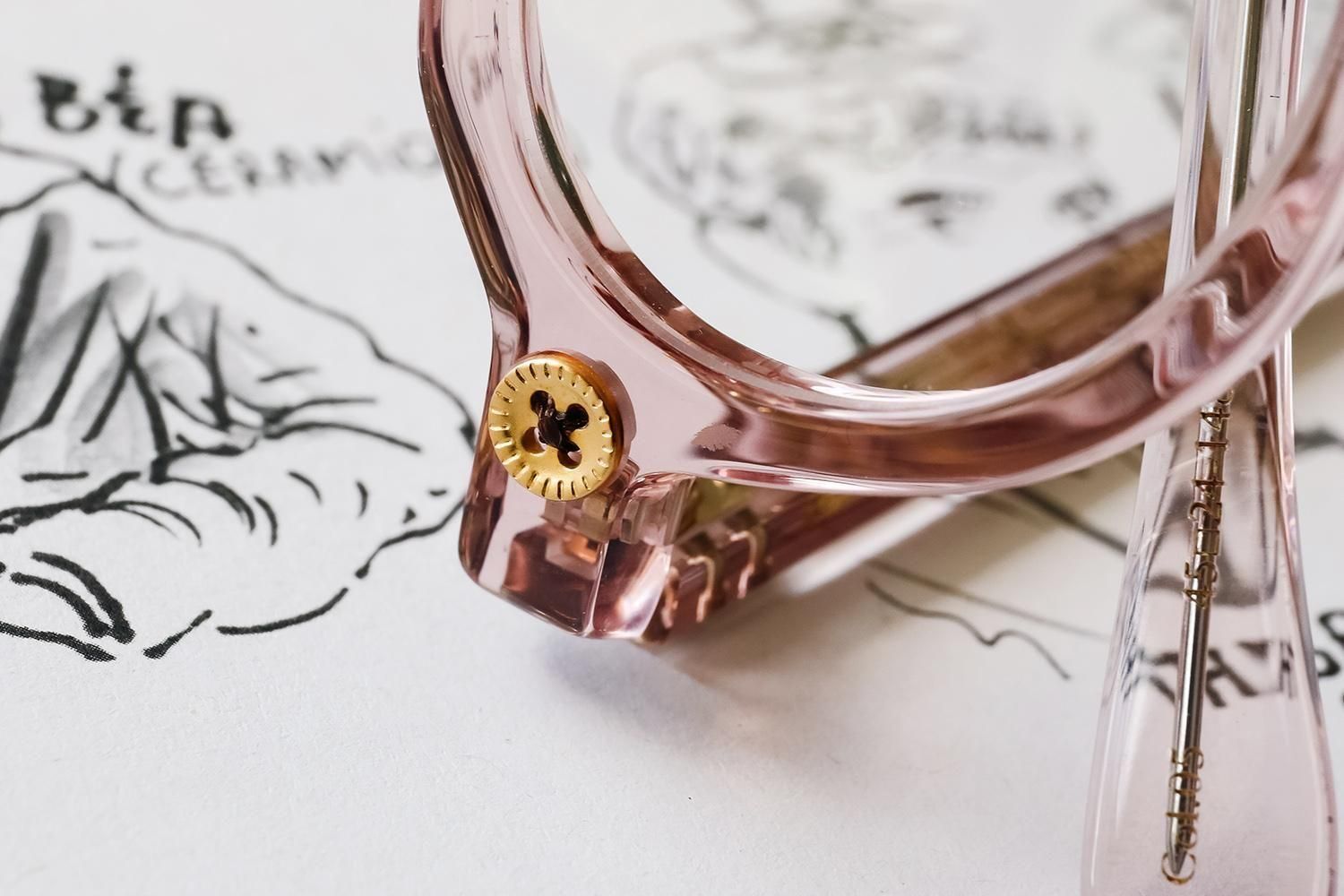 テンプル内部には、縫い針をイメージした芯金が通り、智元には、本物の糸を一本ずつ巻き付けたボタンの飾り鋲。その上から透明レジンで丁寧に固め、立体的で、まるで“アクセサリー”のような仕上がりに。