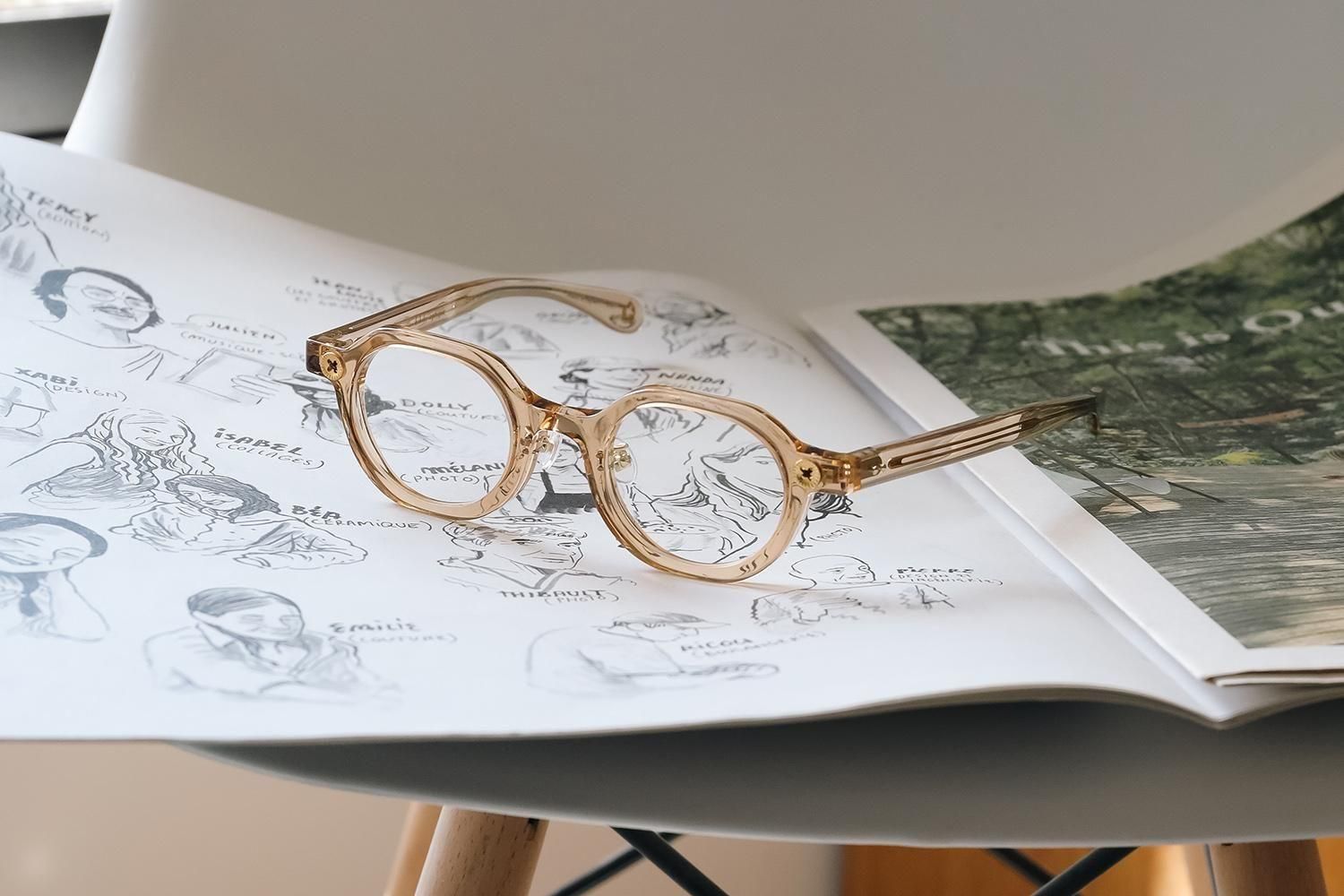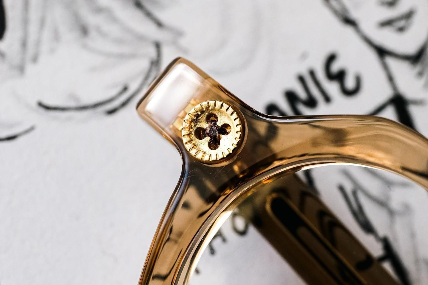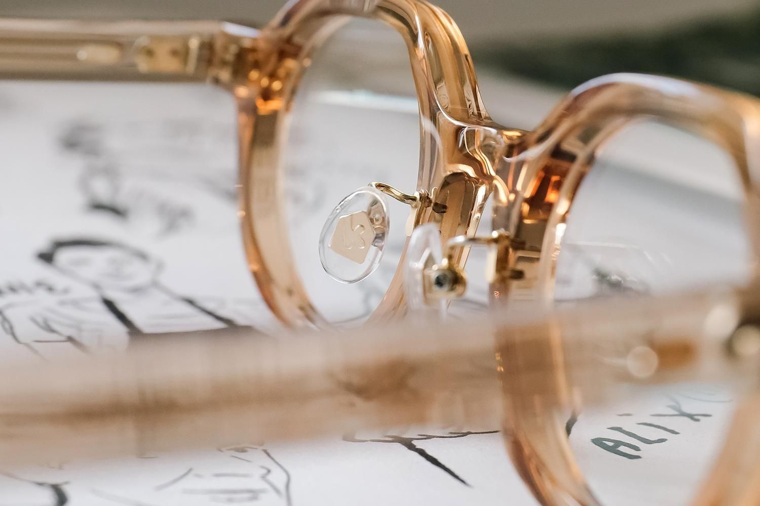 テンプル内部には、縫い針をイメージした芯金が通り、智元には、本物の糸を一本ずつ巻き付けたボタンの飾り鋲。その上から透明レジンで丁寧に固め、立体的で、まるで“アクセサリー”のような仕上がりに。