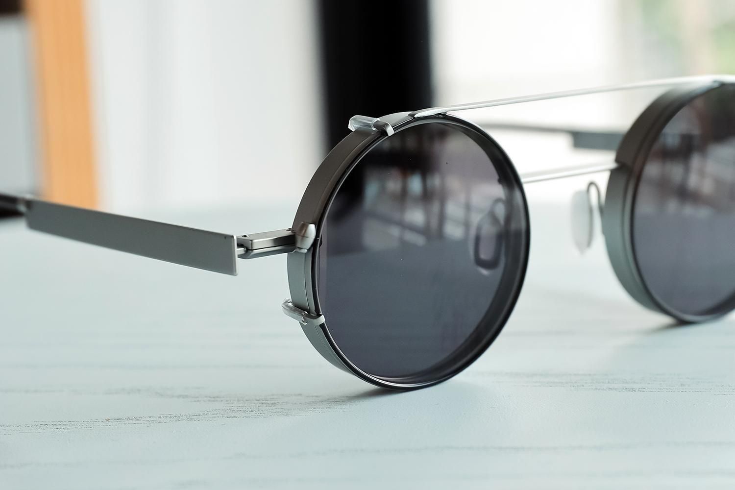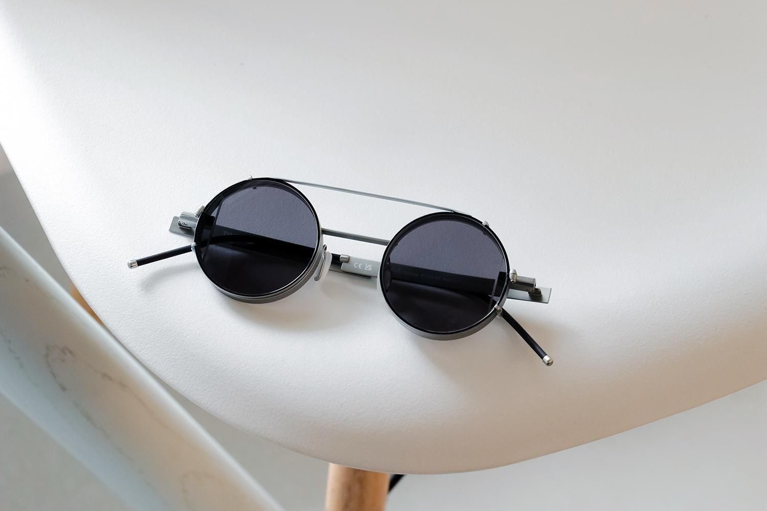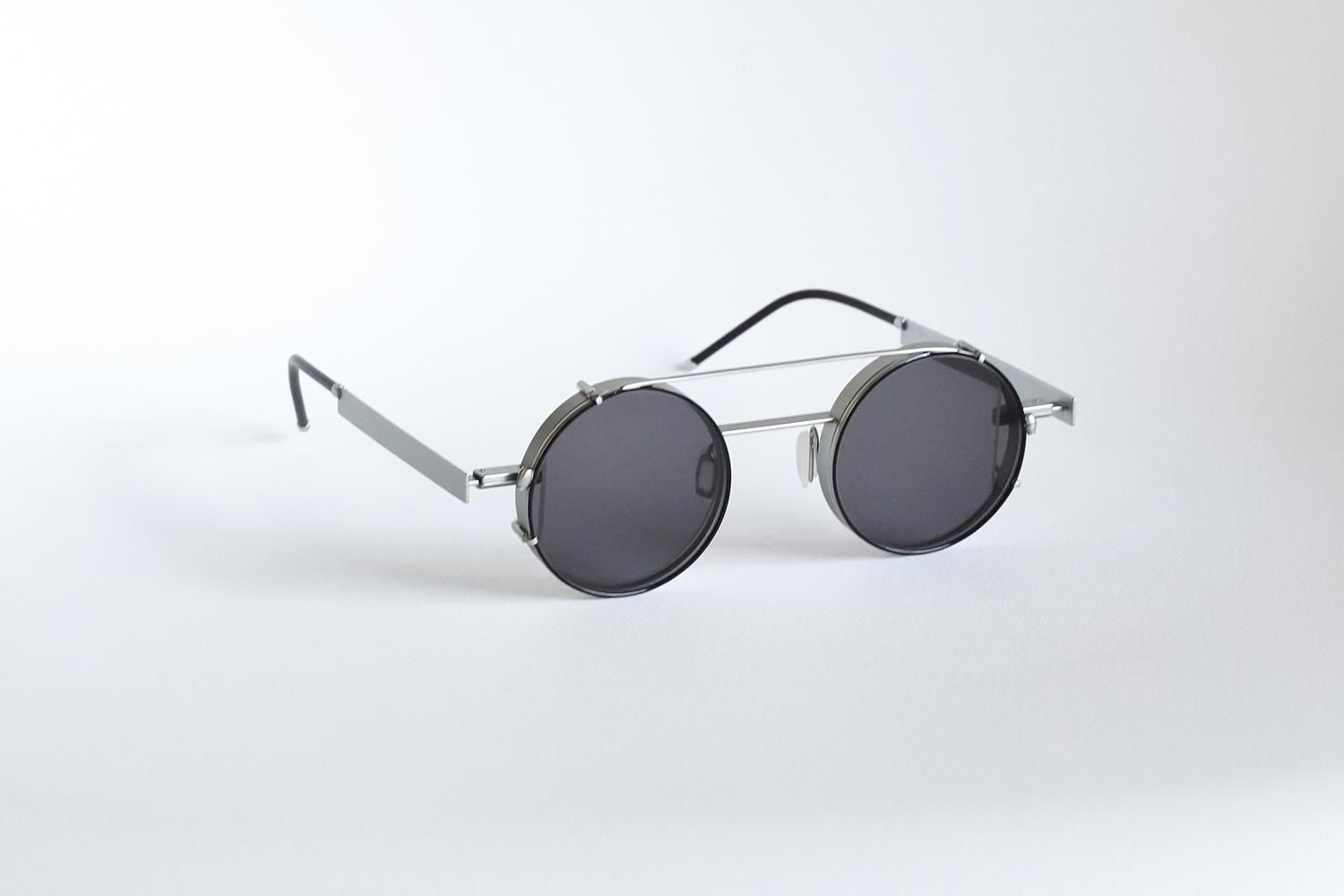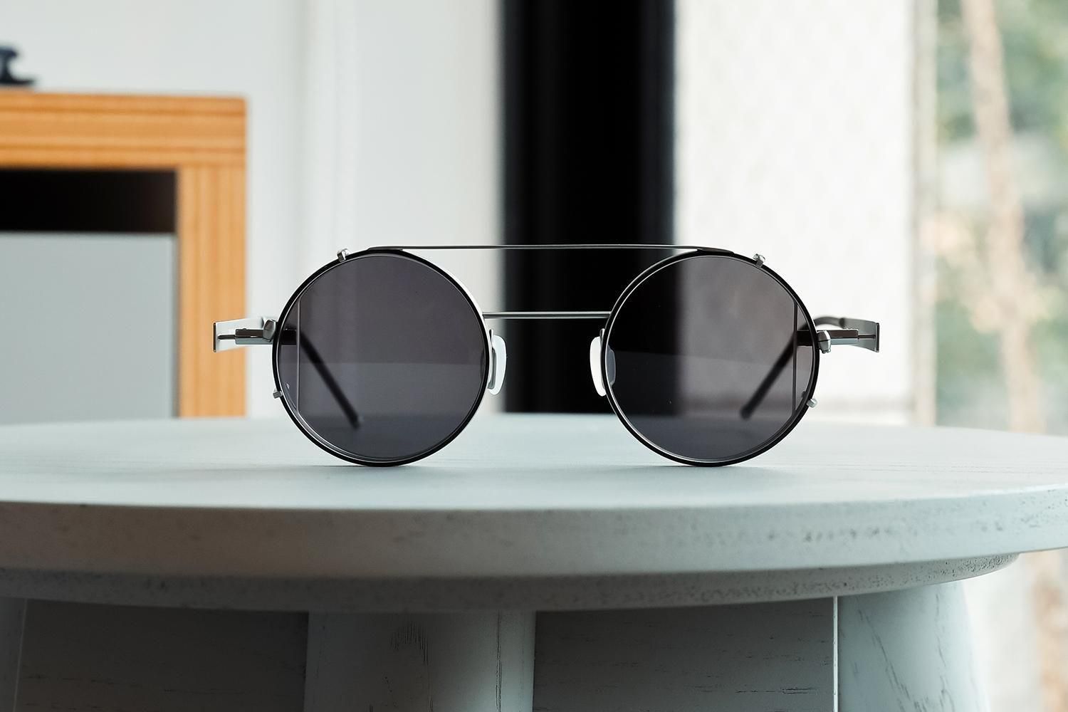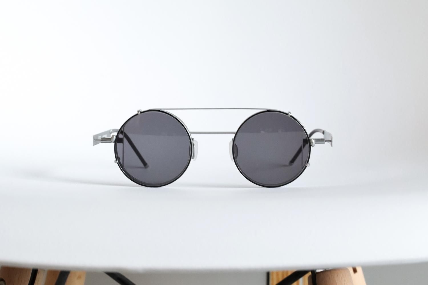 カチッと装着するだけで、アートな丸眼鏡が一瞬でモードなサングラスに変化。