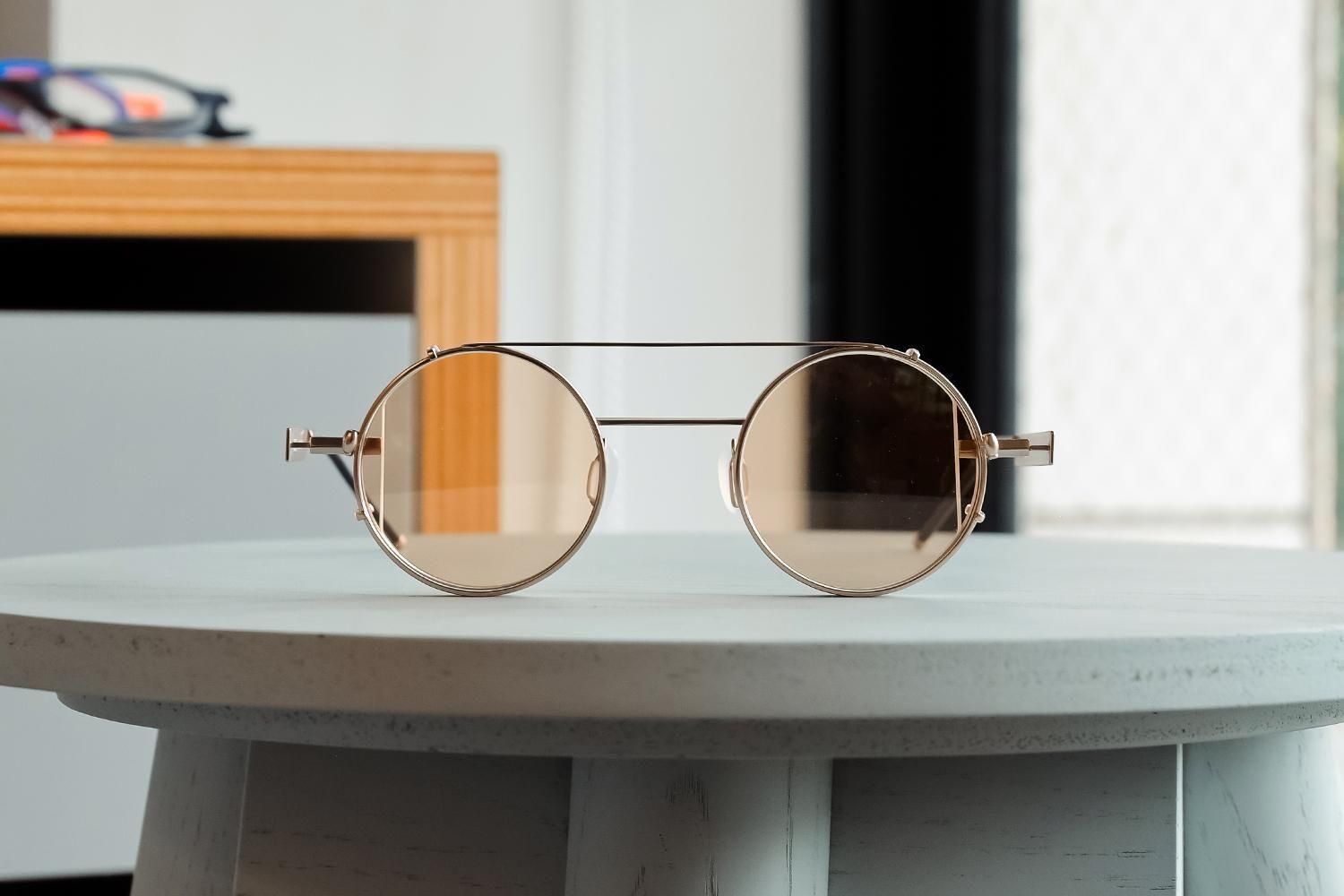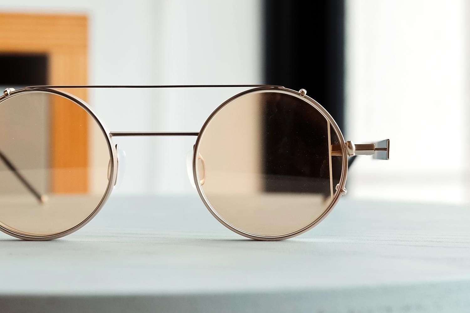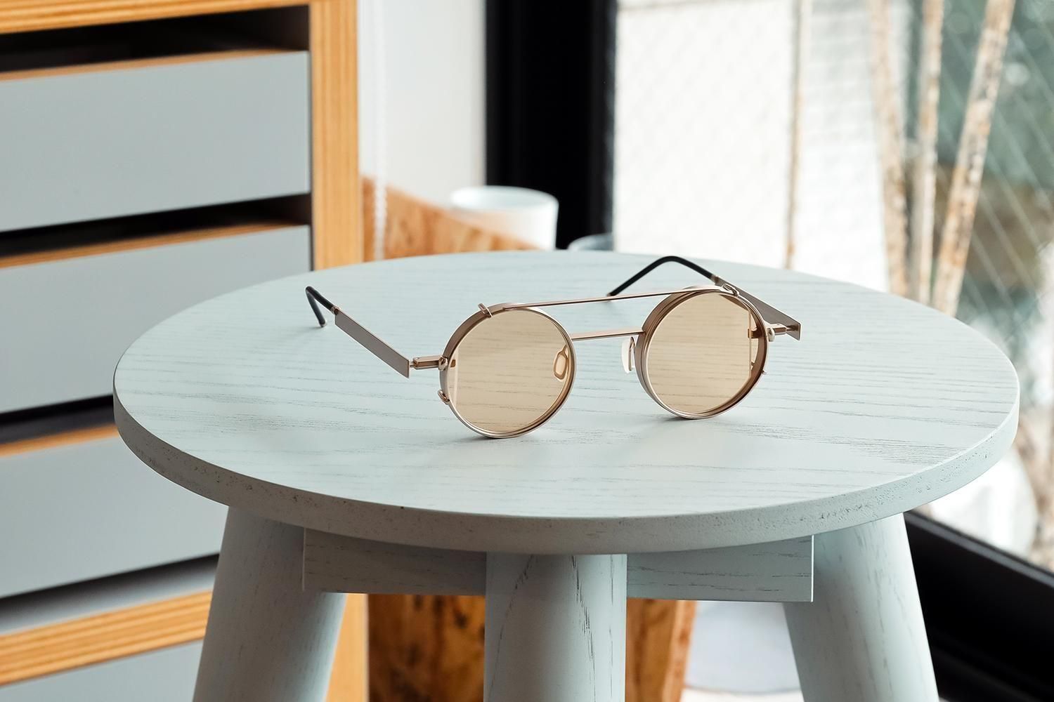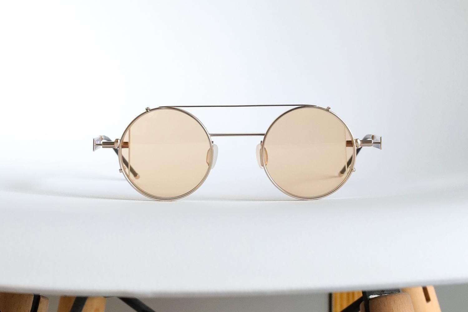 カチッと装着するだけで、アートな丸眼鏡が一瞬でモードなサングラスに変化。
