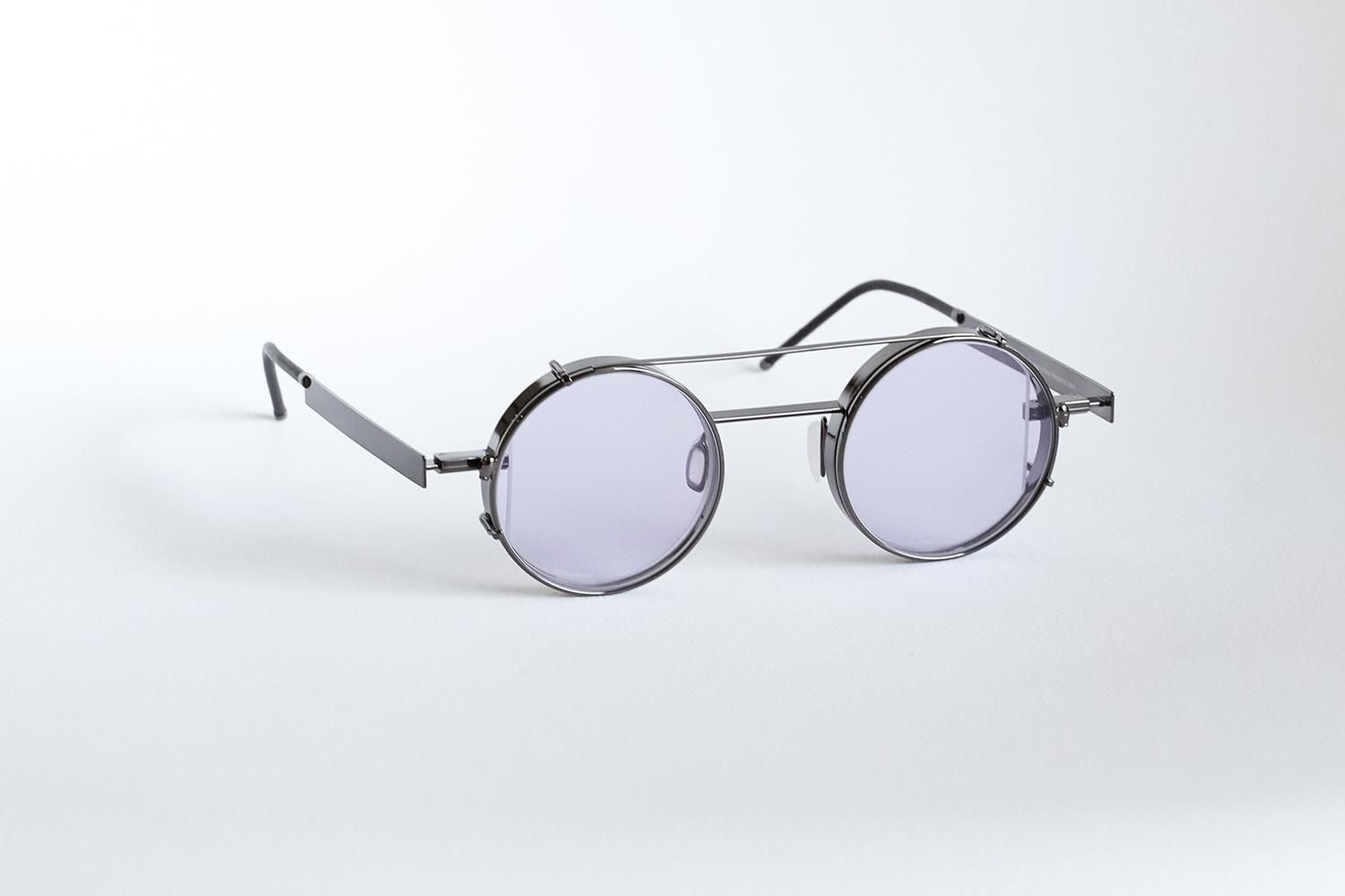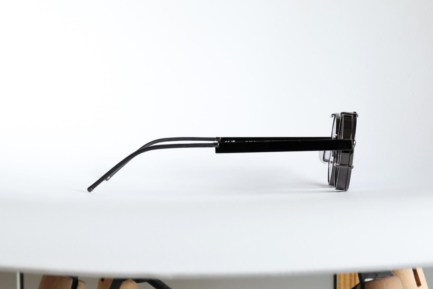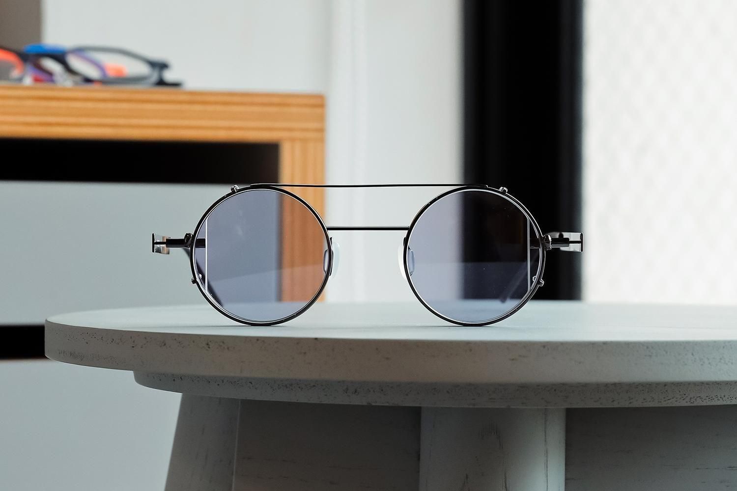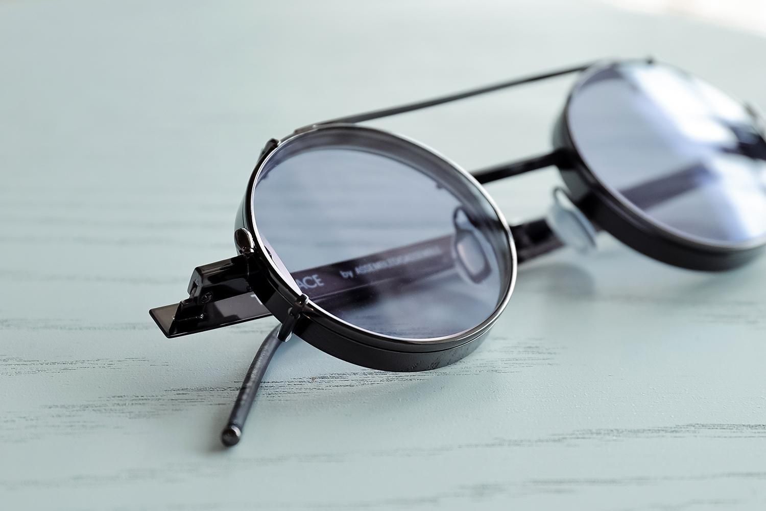 カチッと装着するだけで、アートな丸眼鏡が一瞬でモードなサングラスに変化。