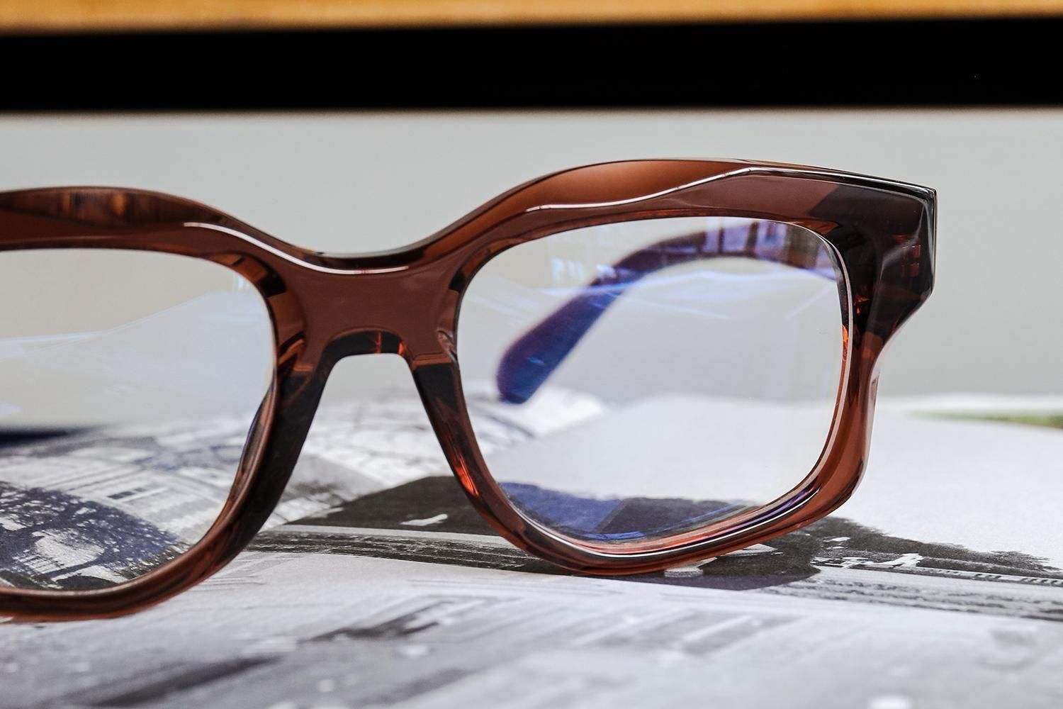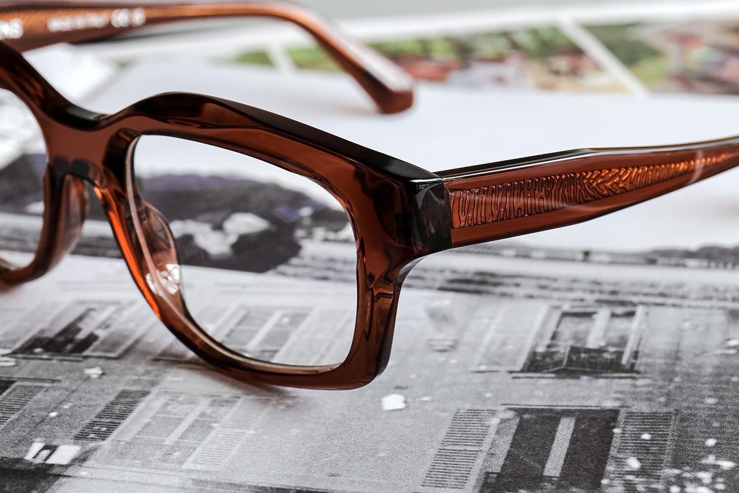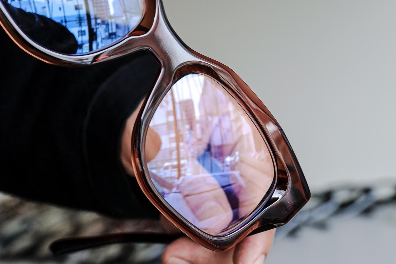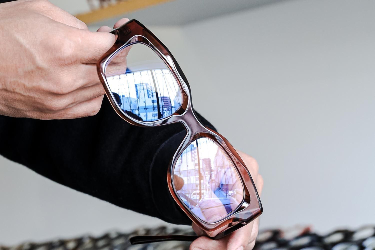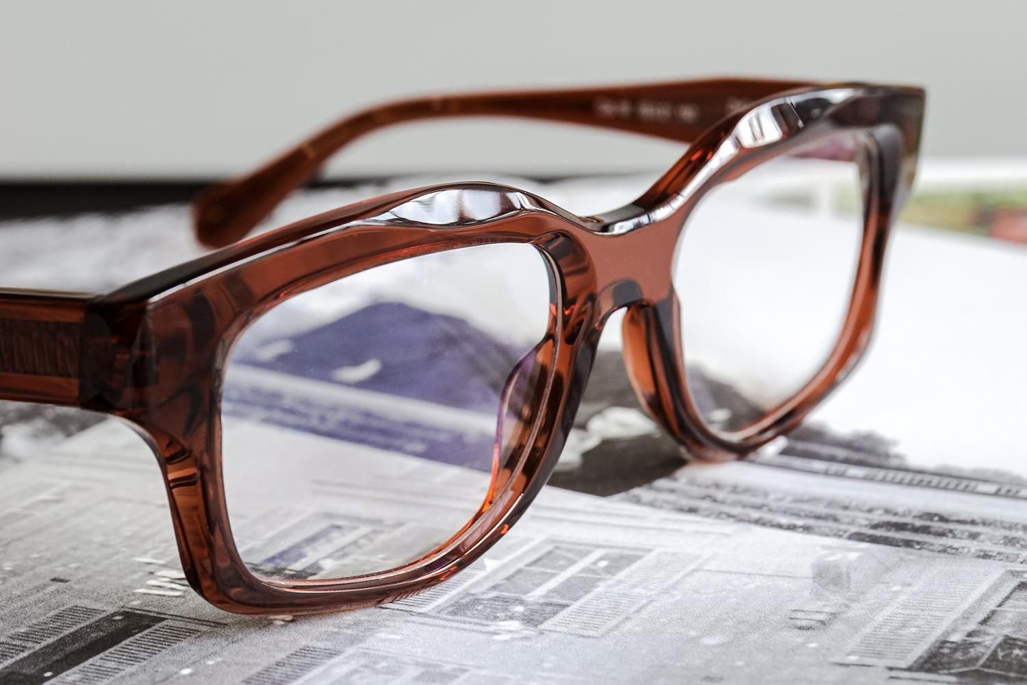 フロントのリムやレンズ周りには繊細なカッティングが施され、光の角度で立体感が変化。陰影の厚みが生まれる。フラットなフレームが多い中で、この奥行きのある造形はちょっと反則級。
