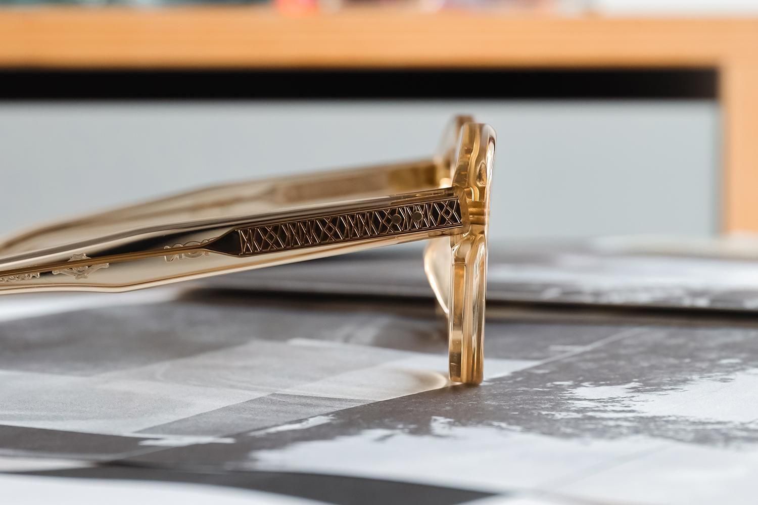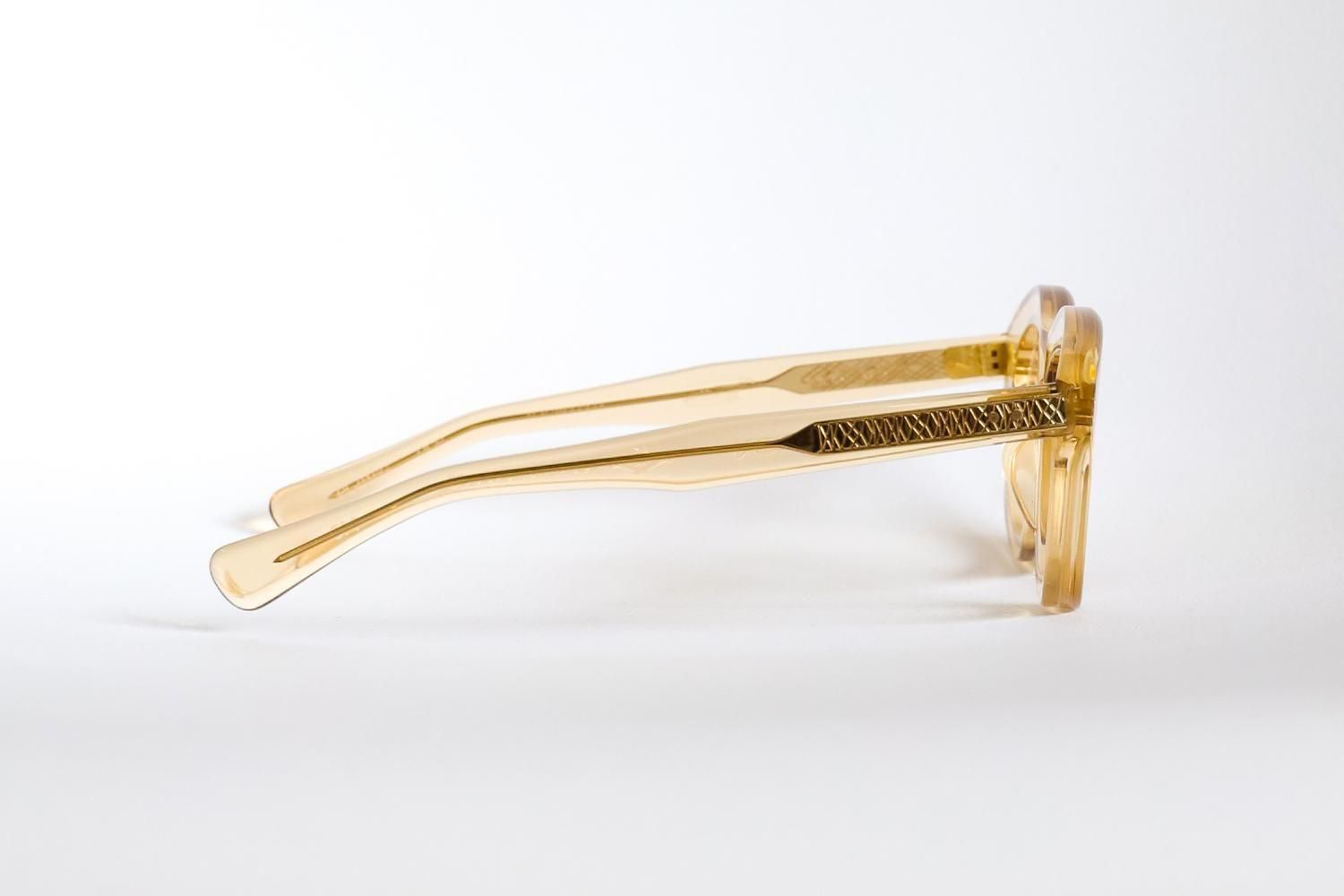 7mm厚のアセテートを大胆に削り出したフロントは、見る角度によって光の映り方が変わる立体的な造形。厚みの中に柔らかなカーブを描きながら、ブリッジから智(ヨロイ)までのラインが流れるように続いています。