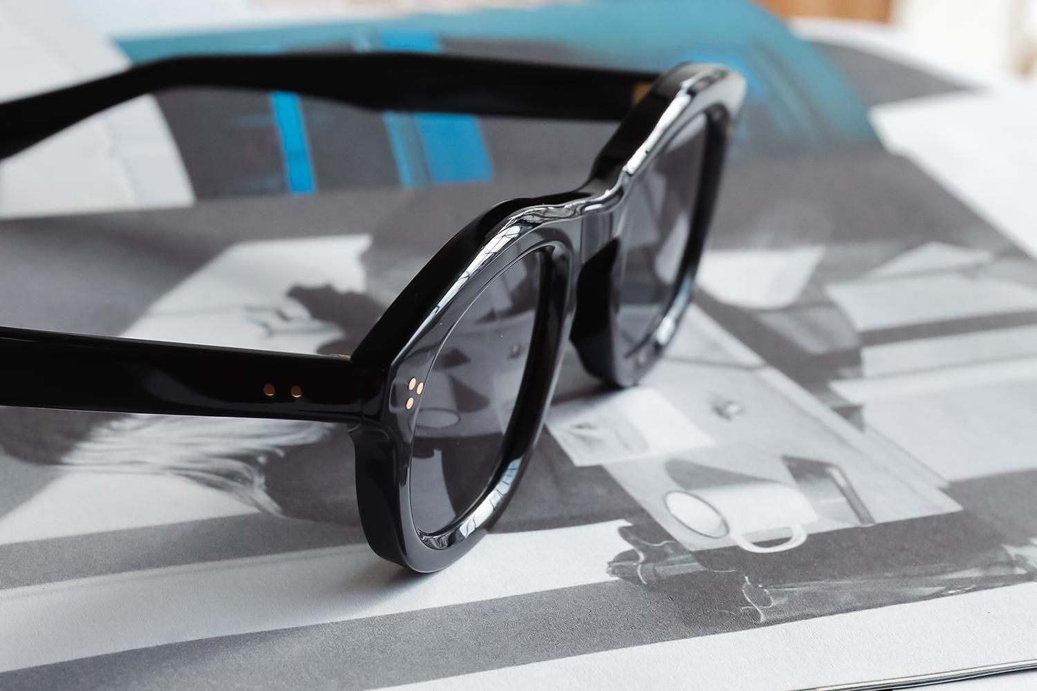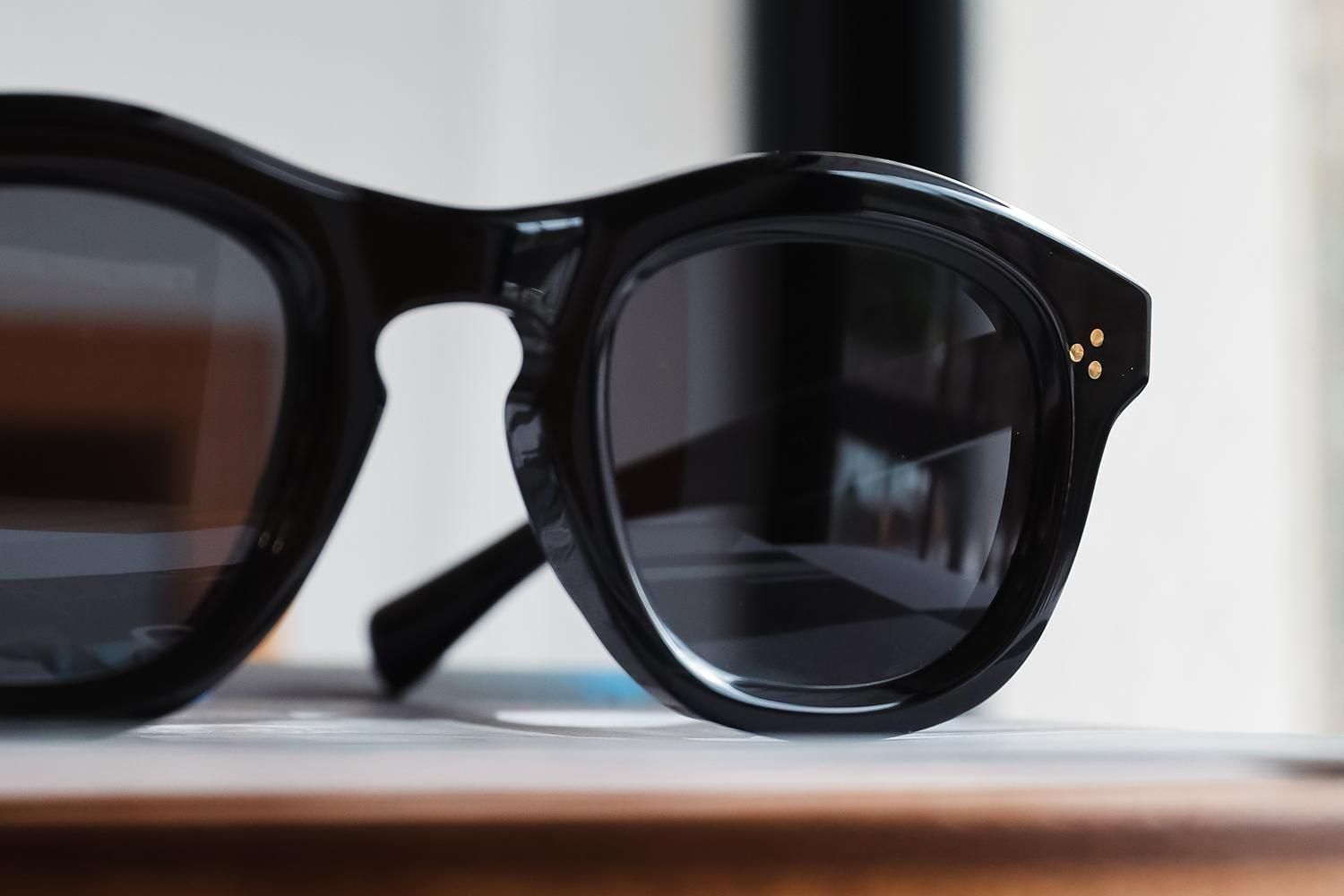 7mm厚のアセテートを大胆に削り出したフロントは、見る角度によって光の映り方が変わる立体的な造形。厚みの中に柔らかなカーブを描きながら、ブリッジから智(ヨロイ)までのラインが流れるように続いています。
