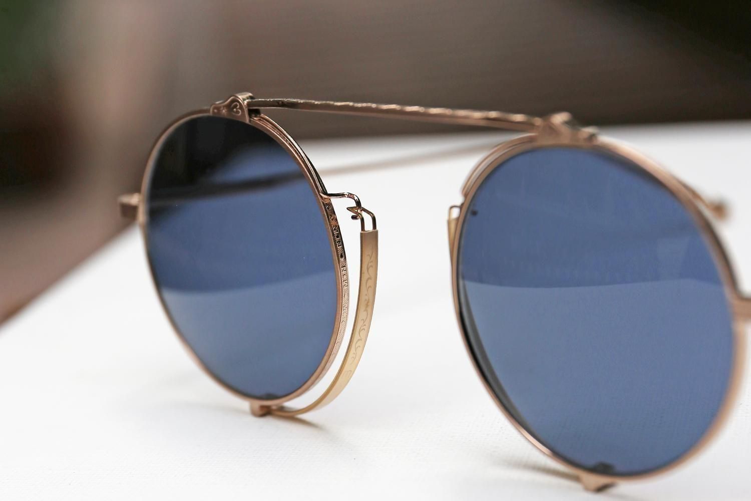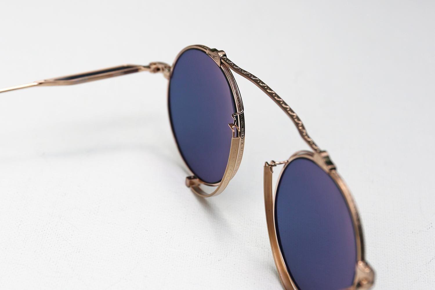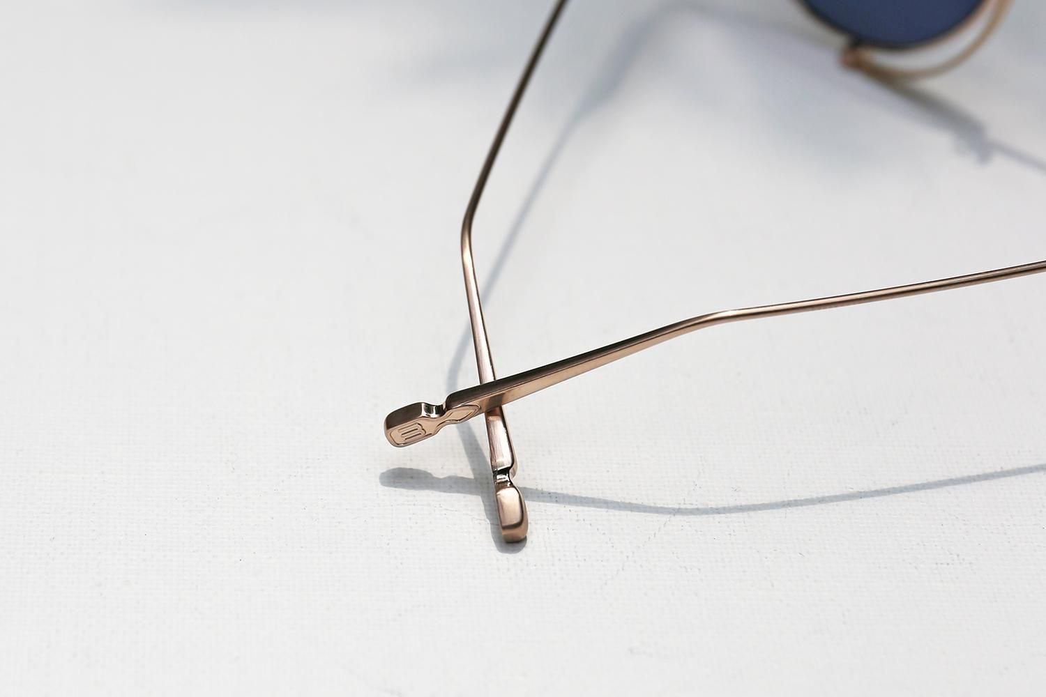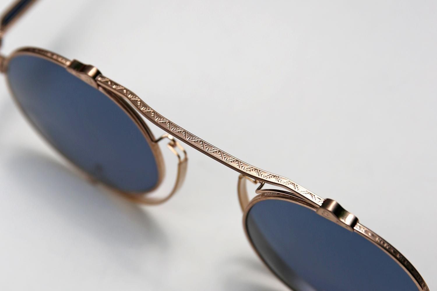 ブリッジやテンプルに施されたアンティーク調の繊細な彫金(エングレービング)は、ブランドの真骨頂であります。