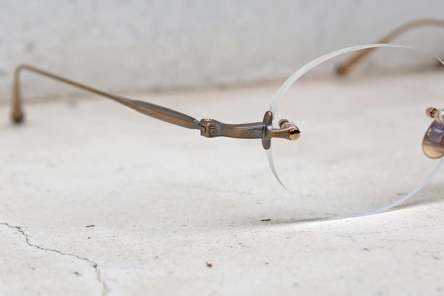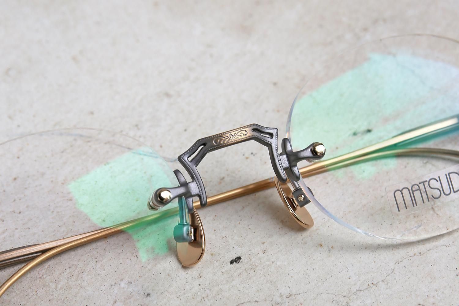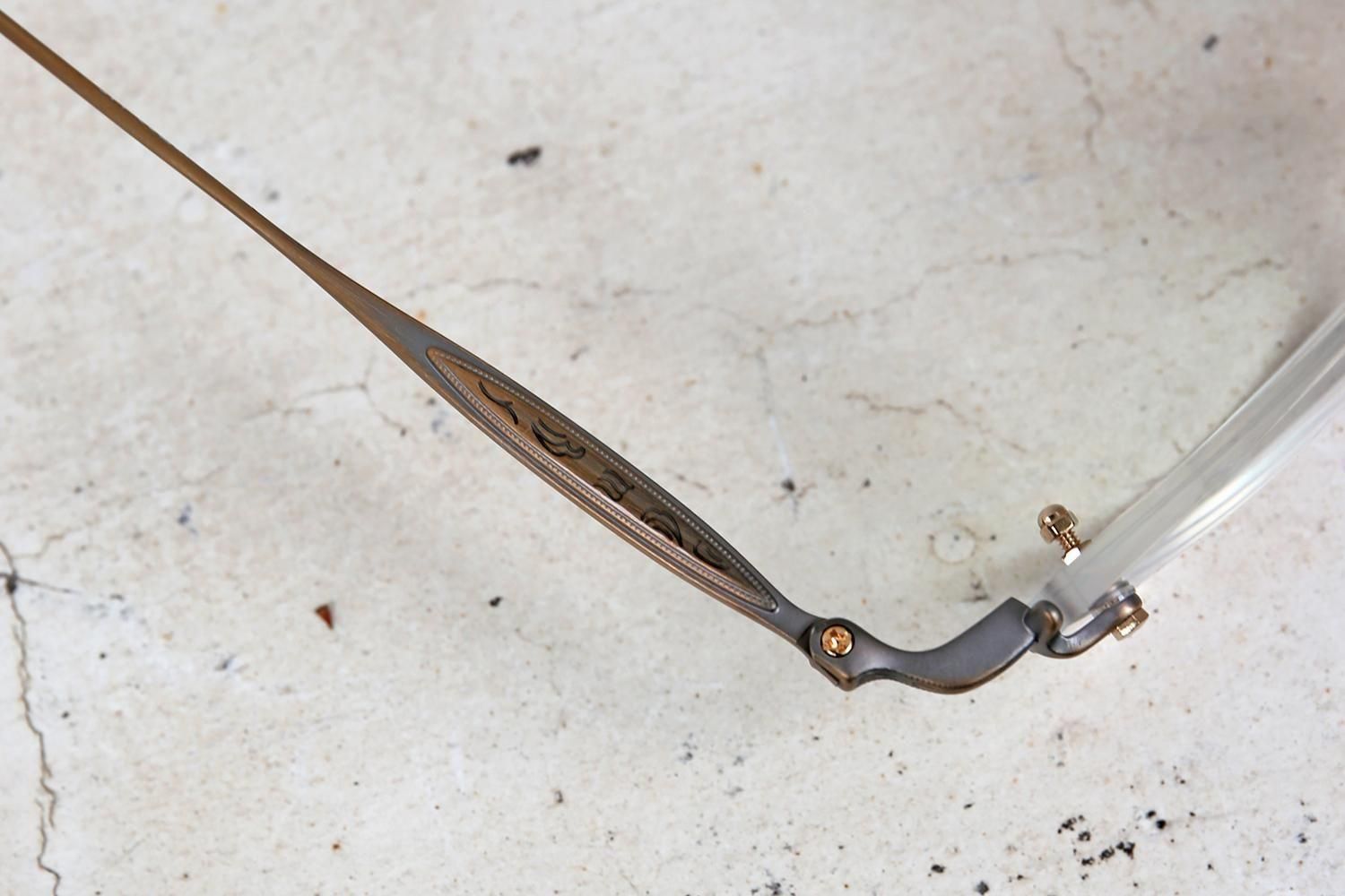 MATSUDAといえば、息をのむような美しい彫金のディティールが真髄ですが、レンズ周りのフチがない分、ブリッジやヨロイ、テンプルの彫金や造形美が目を惹きます。