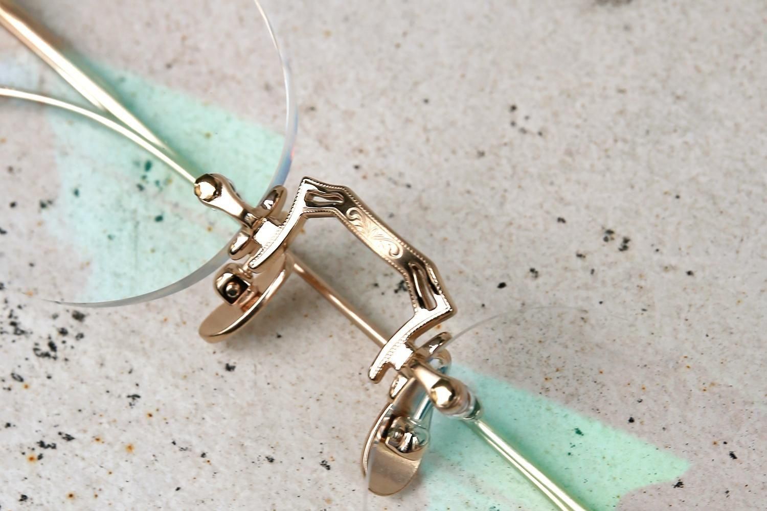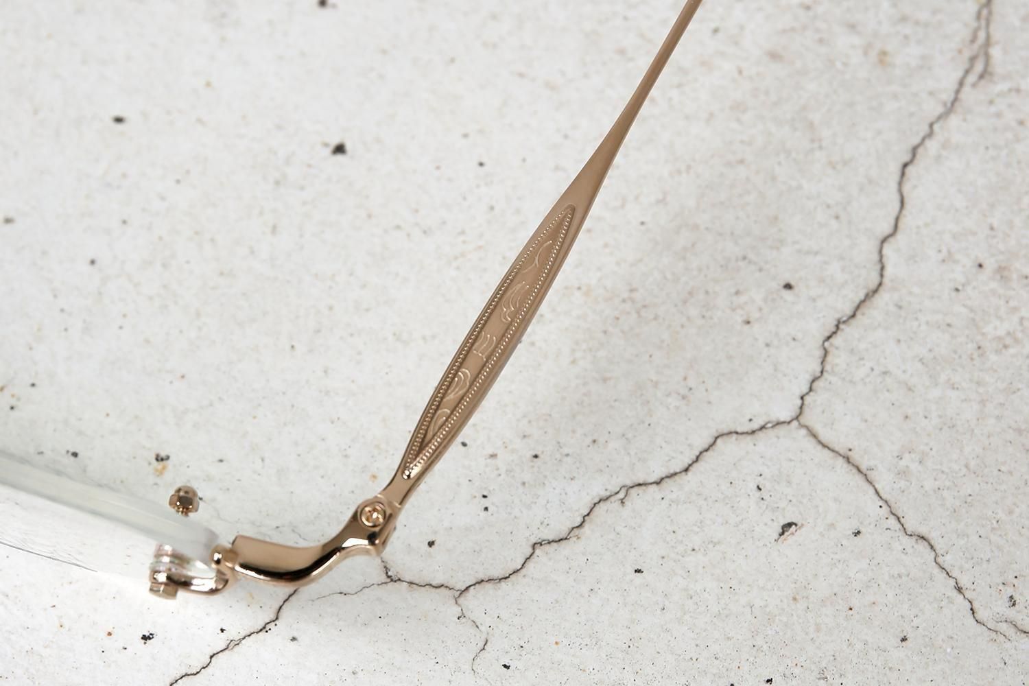 熟練の職人により彫り込まれた装飾は、まるで美術品のような細やかさ。金属パーツが持つ素材の美しさを最大限に引き出し、シンプルなリムレスデザインに深みと高級感を与えています。