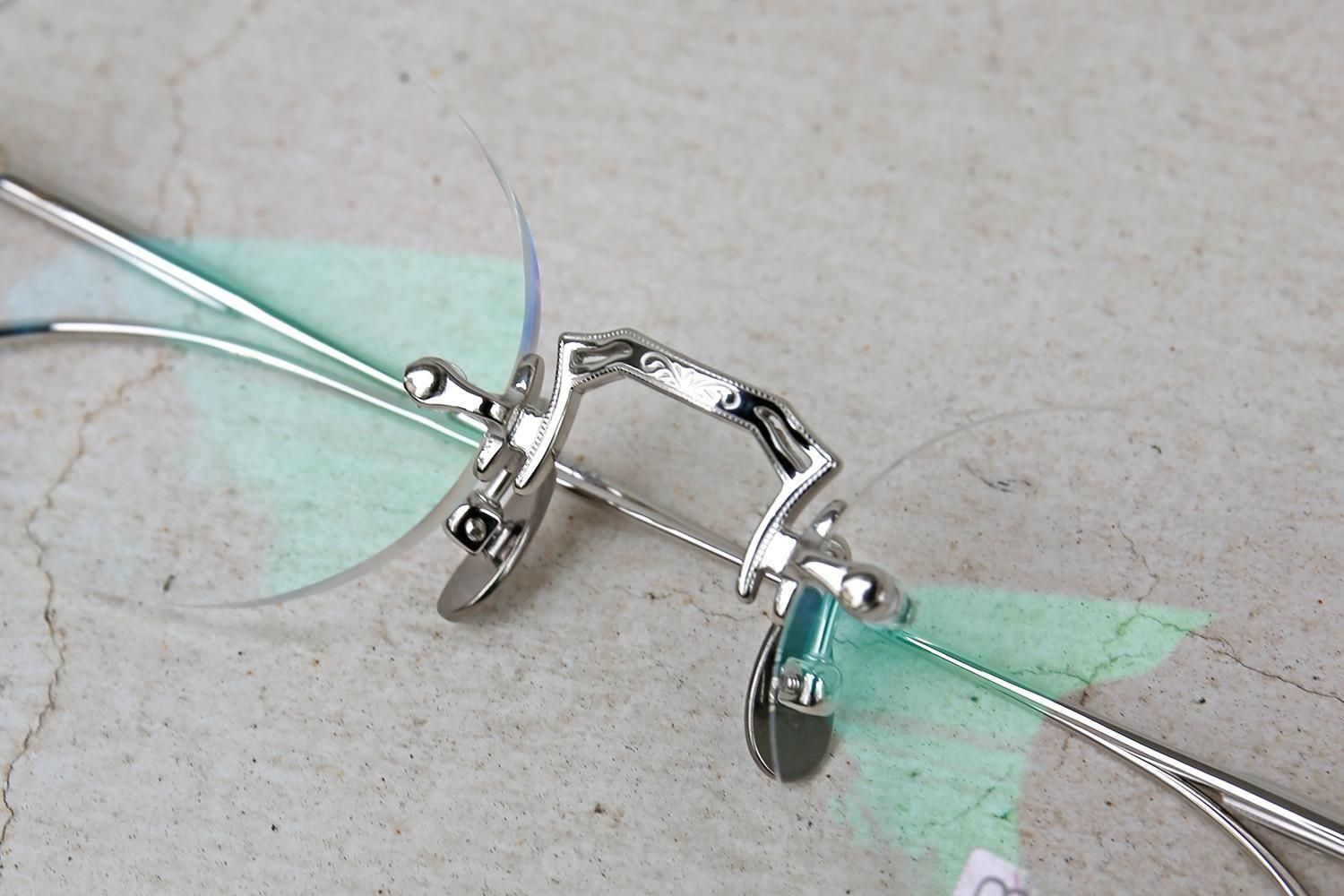 熟練の職人により彫り込まれた装飾は、まるで美術品のような細やかさ。金属パーツが持つ素材の美しさを最大限に引き出し、シンプルなリムレスデザインに深みと高級感を与えています。