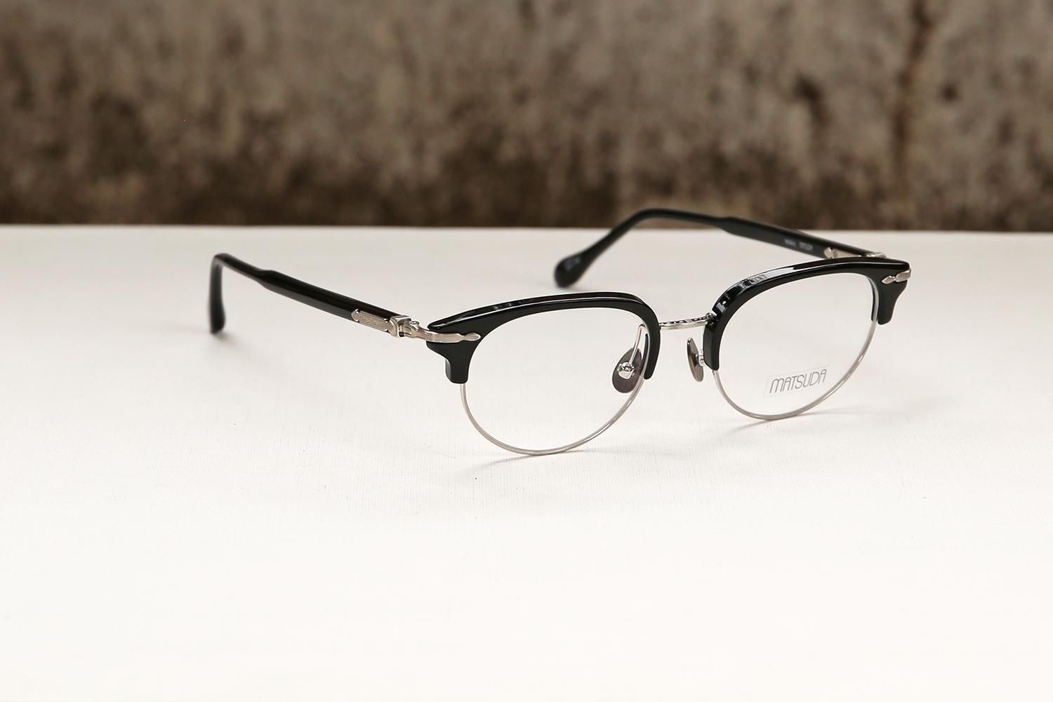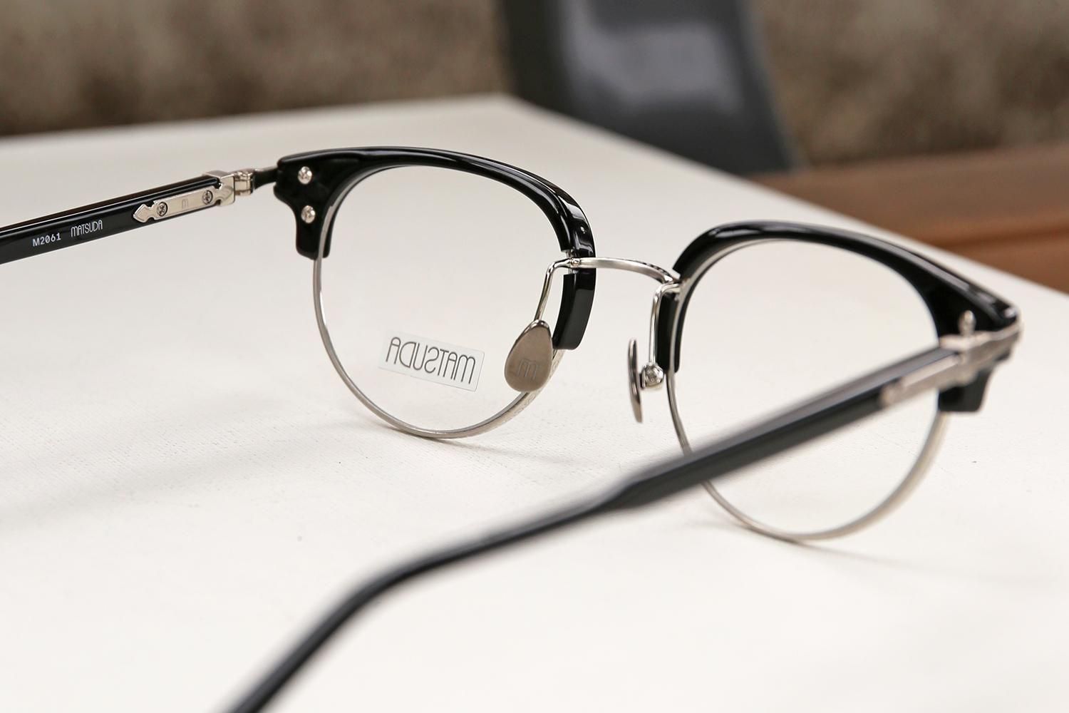 テンプル(つる)には、アンティークジュエリーを思わせる細やかな彫金が施されたメタルパーツが埋め込まれており、横顔に華やかなアクセントを加えます。また、テンプルエンドと智元パーツ、ブリッジにはブランドの「M」マークが施され、細部にまでMATSUDAの美意識が貫かれています。