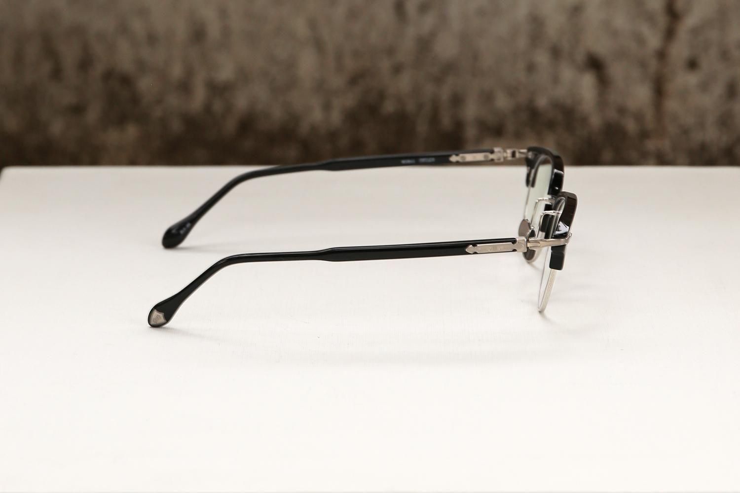 眉を強調する伝統的なサーモント(ブロー)スタイルを基調としながら、レンズ部分に丸みを持たせ、繊細なブローラインにより、威圧感を排した柔和で知的な表情を生み出しています。