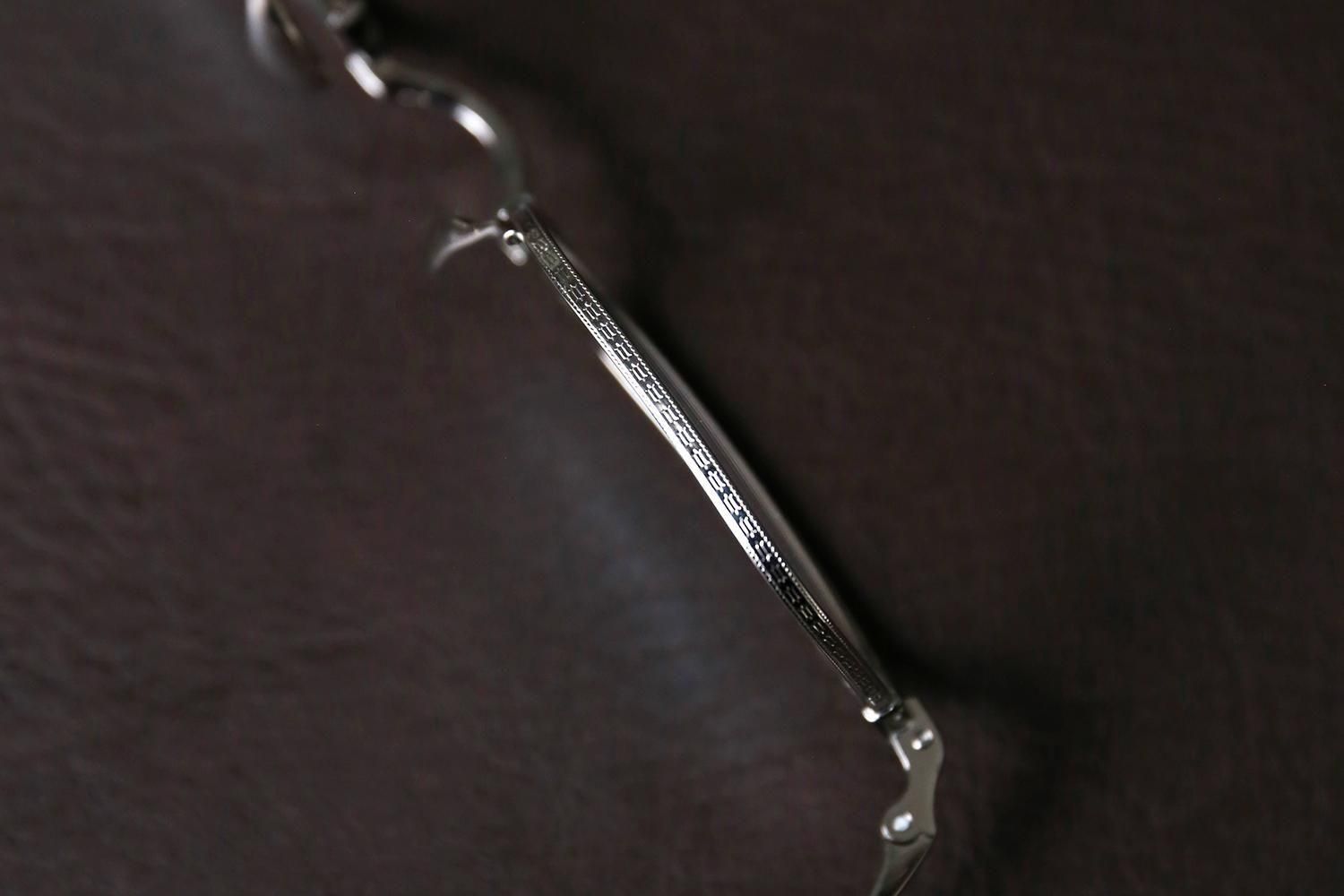 メタルリムの厚みに強弱をつけることで表現された、擬似的なブロウスタイルです。フロント上部に施された七宝やメッキのカラーリングが、幾何学的なレンズシェイプをくっきりと縁取り、目元に程よいインパクトと引き締め効果をもたらします。丸みのある眼鏡よりも、すっきりと洗練された印象を与えたい方にオススメなデザインです。